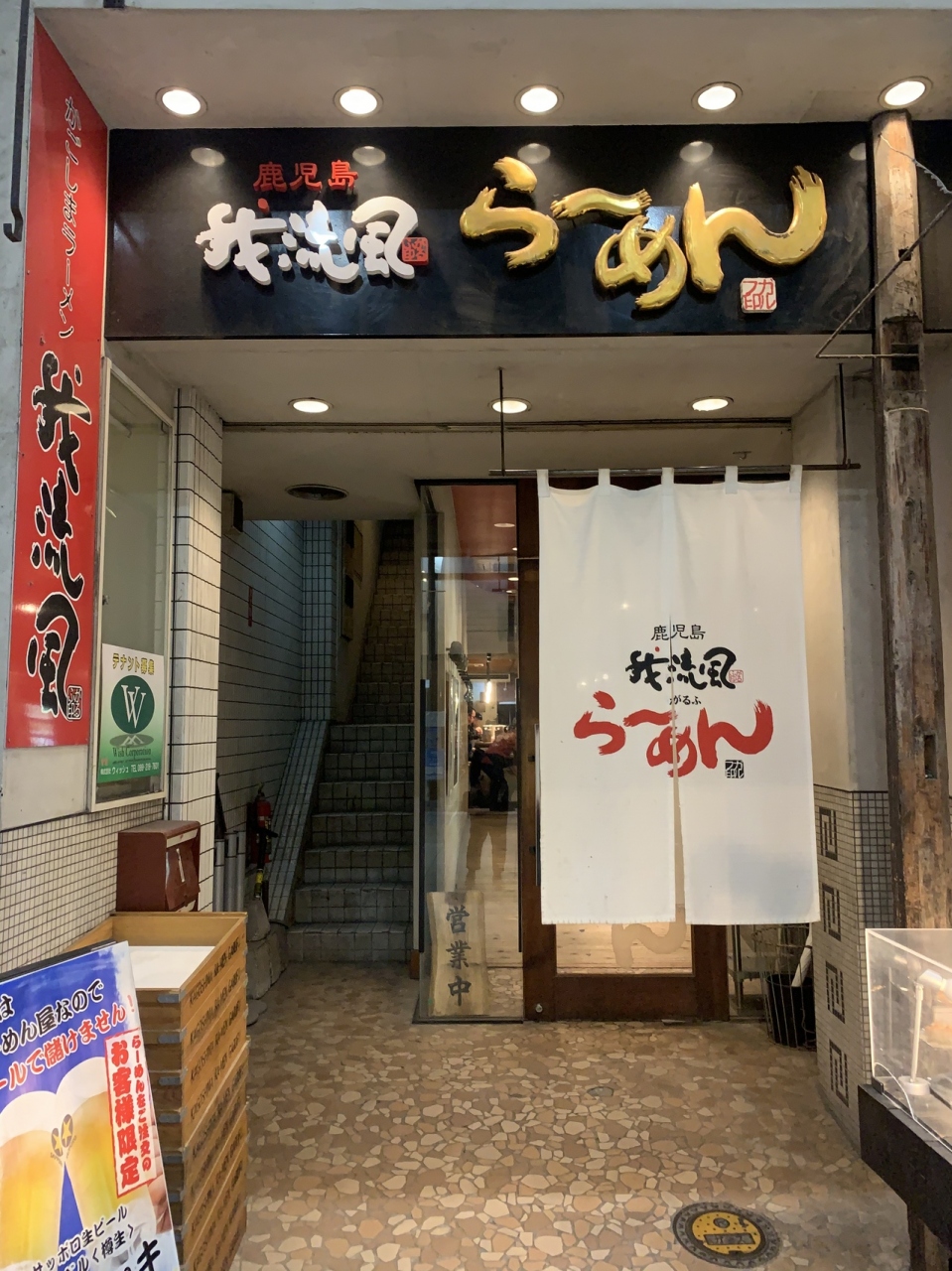 天文館のホテルに泊まったのでガイドブックに載っていた近くにある鹿児島ラーメンの店・我流風に行ってきました。昭和43年の老舗ラーメン店で豚骨スープともっちりとしたストレート麺で美味しかったです。ラーメンを注文すると生ビールの中ジョッキが200円でした。