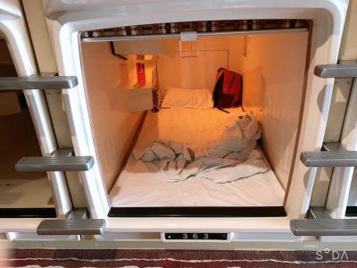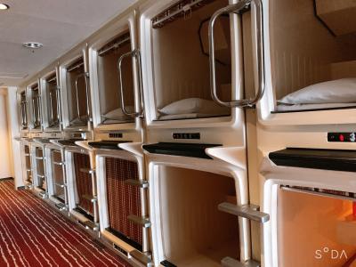 福山市内にある古いカプセルホテルです。料金は3,000円とコスパはいいです。少し歩きますが無料の駐車場もあります。施設は全体的に古く、不衛生感もあって泊まっている人も平日の緊急事態宣言解除後のためかあまりいなかったです。コインランドリーが6階にあるというので行ったら真っ暗で怖くて捜すのも諦めました。カプセル内にコンセントがないので、携帯の充電は有料です。