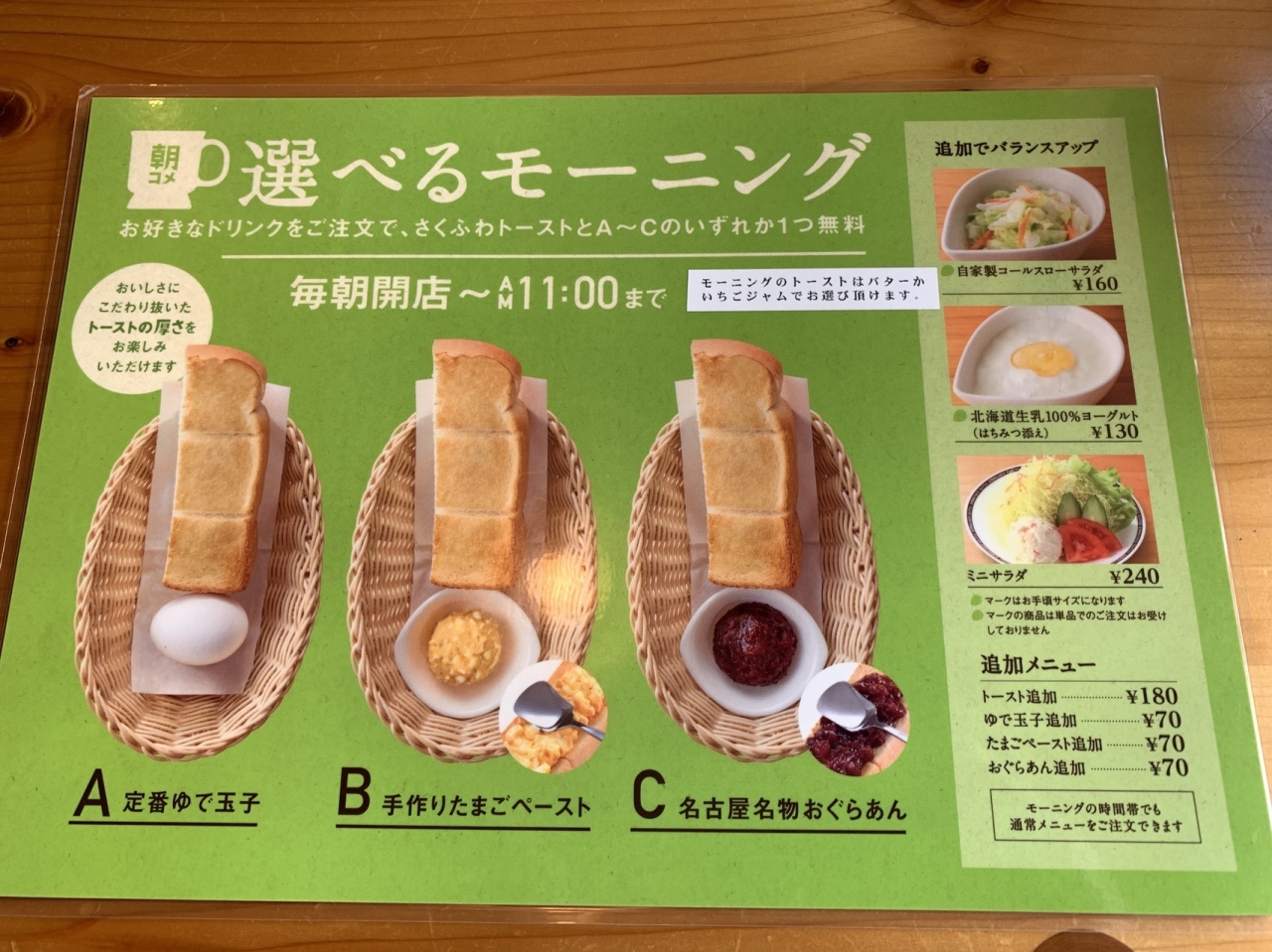 朝食を食べに10時くらいに近くのコメダ珈琲に行き、コーヒーとホットドッグを注文すると店員の女の子がモーニングでなくてもいいですか?と聞かれてメニューを見るとコーヒーを注文するとトーストと卵などが無料でついてくるモーニングセットがありとても得をした気分になりました。モーニングは厚切りトースト半分と「ゆで卵」「たまごペースト」「おぐらあん」の中からひとつ選べます。
