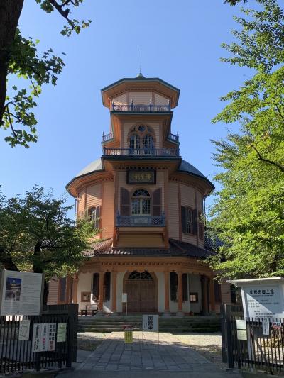 山形市の霞城公園の隅っこにあって、木に囲まれていて気にしていないと見過ごしてしまいます。旧済生館本館は、明治時代に建てられた山形県立病院で後に市立病院となった建物で、建物の派手な色合いといい作りといい洋風を真似て奇抜になった感じ。明治初期の擬洋風建築の傑作と言われ国の重要文化財に指定されています。建物自体はこじんまりとしていい感じで、涼しげな中庭を中心にドーナツ型に部屋が配置されて正面は多角形4層の塔になっています。ステンドガラスや螺旋階段などがあり細部に工夫が施されています。各部屋には郷土資料や医学資料が展示されています。