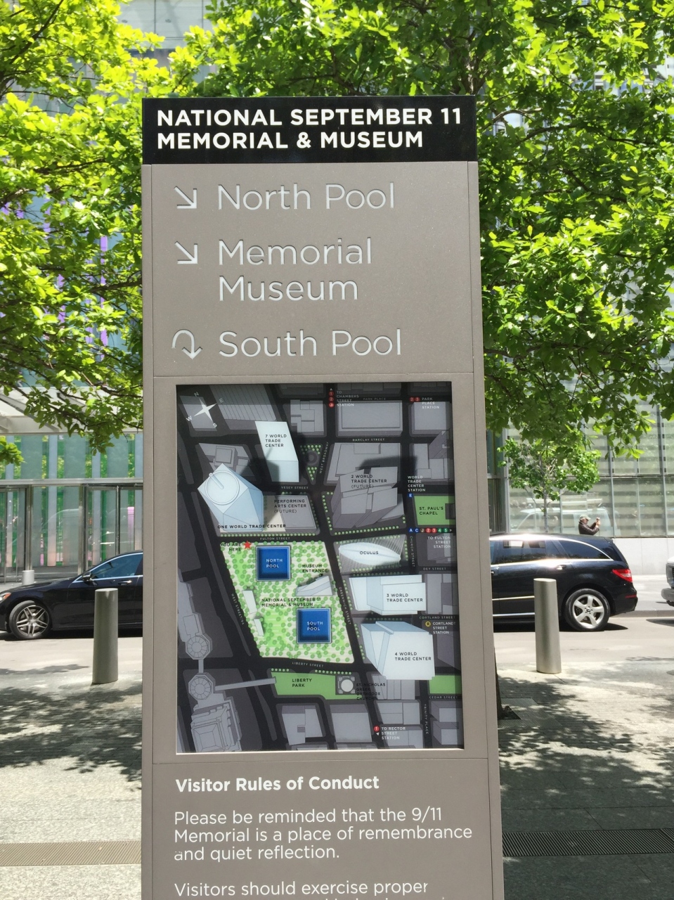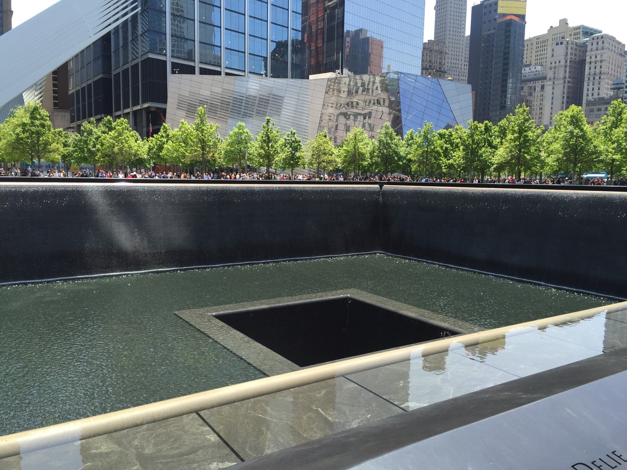 ニューヨークに来たからには訪れてみようと思っていた場所で、かってツインタワーがあった場所には巨大な滝のあるプールが2つ作られており、その周りには犠牲となった3000人の方の名前が刻まれているとの事。