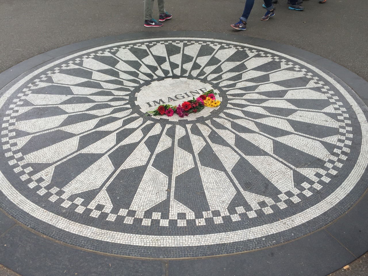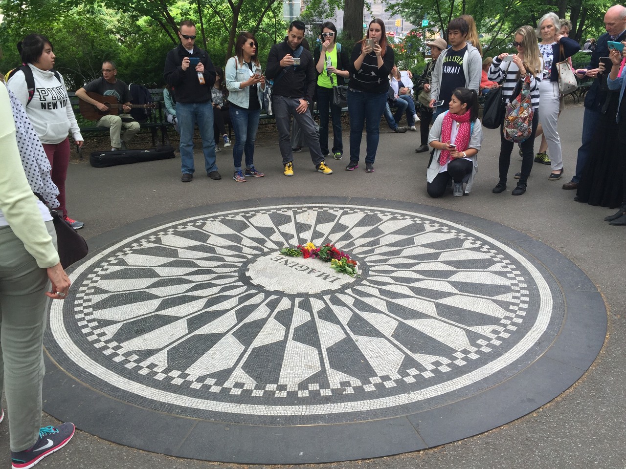 オノヨーコさんがデザインした円形のモザイクが歩道に設置されていて、多くの人が周りで記念写真を撮ったりしていた。献花をしたり、そばのベンチで「イマジン」をギターで弾いて歌っているおじさんとかもいて死後何十年たっても多くの人に想われているのを感じた。