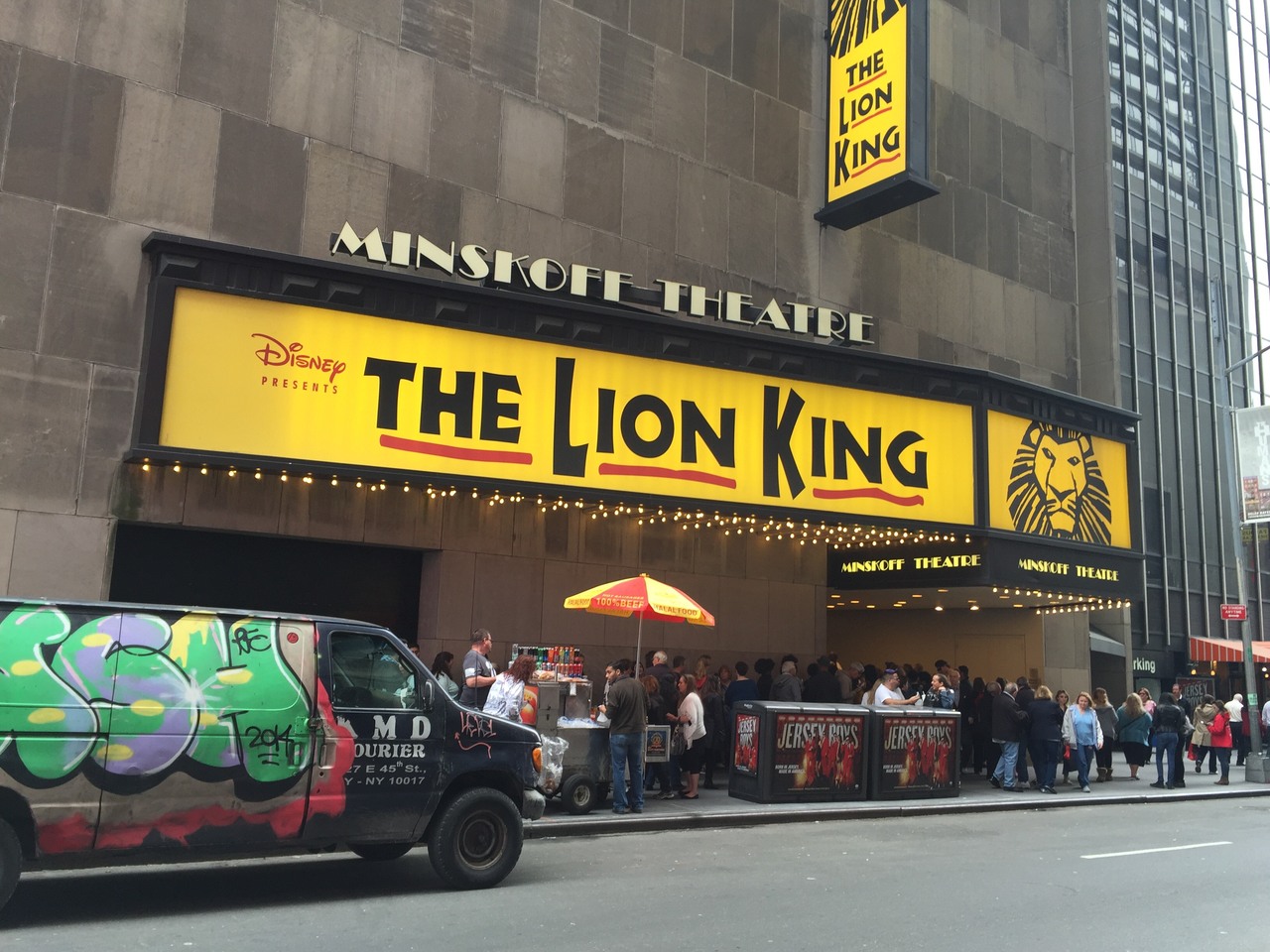 ニューヨークに行ったらブロードウエイでミュージカルを見ようと思い、英語がわからなくても十分楽しめるとの口コミで「ライオンキング」のチケットを日本で申し込み行ってきました。「ライオンキング」のミンスコフ劇場はタイムズスクエアの交差点からすぐでわかりやすく地図を片手に迷わず行けました。30分ほど前に行きましたが多くの人がもう並んでいて、劇場の1階でバーチャルチケットをチケットに交換してもらい、並んでエレベーターで2階へと上がっていきます。席は前から3番目ととてもよくて迫力あるミュージカルが堪能できました。