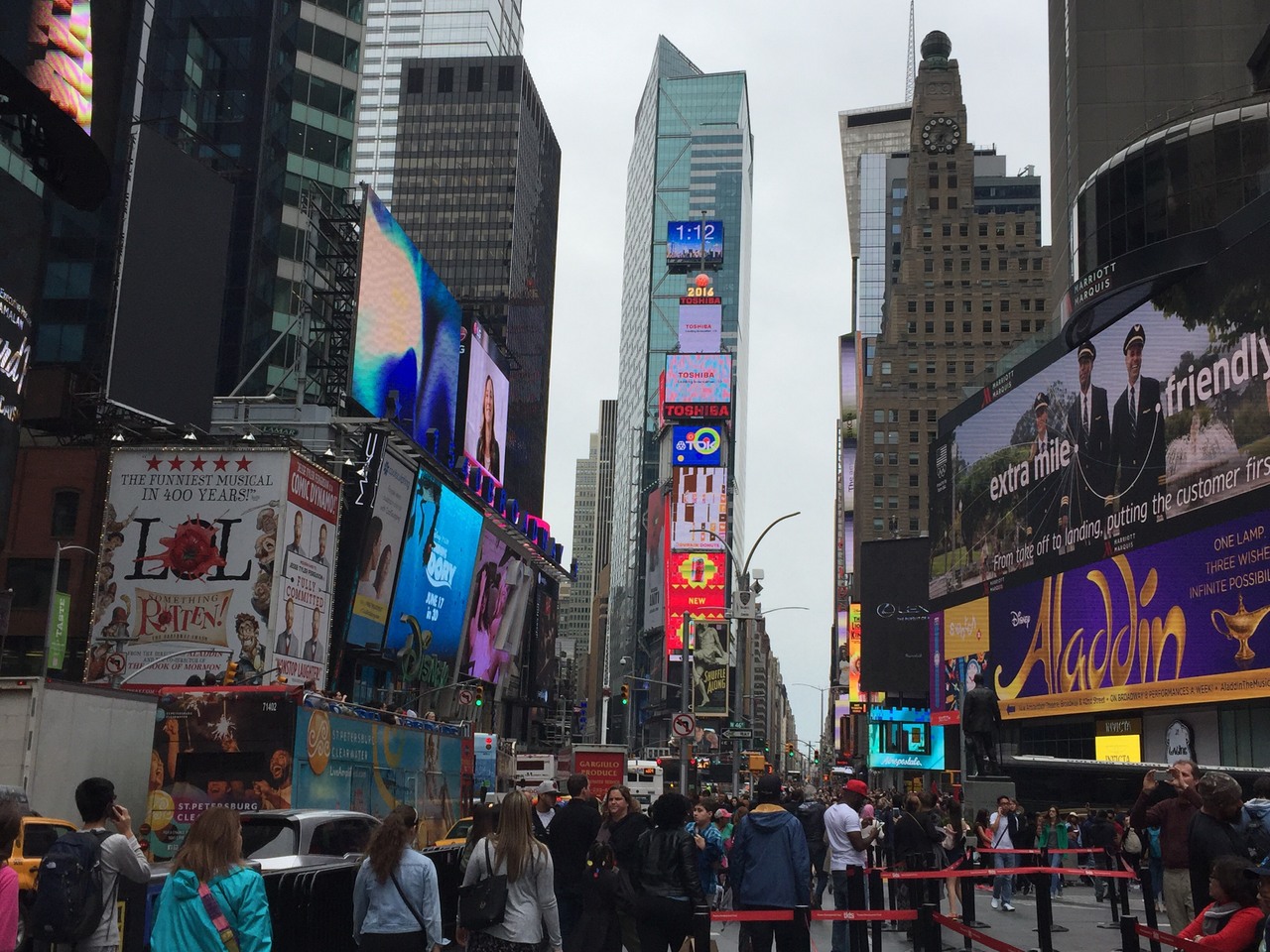 夕食を食べた後にエンパイア―ステートビルまで夜景を見に行く途中に観光の定番なので寄りました。ブロードウエイの通りを南下していて、見たことのあるタイムズスクエアの交差点のネオンを見るとテンションが上がりましたが、多くの人が集まっているただの交差点でした。次の日の昼にもタイムズスクエアに行きましたが、昼でもネオンは派手に輝いていましたが人の多いただの交差点でした。