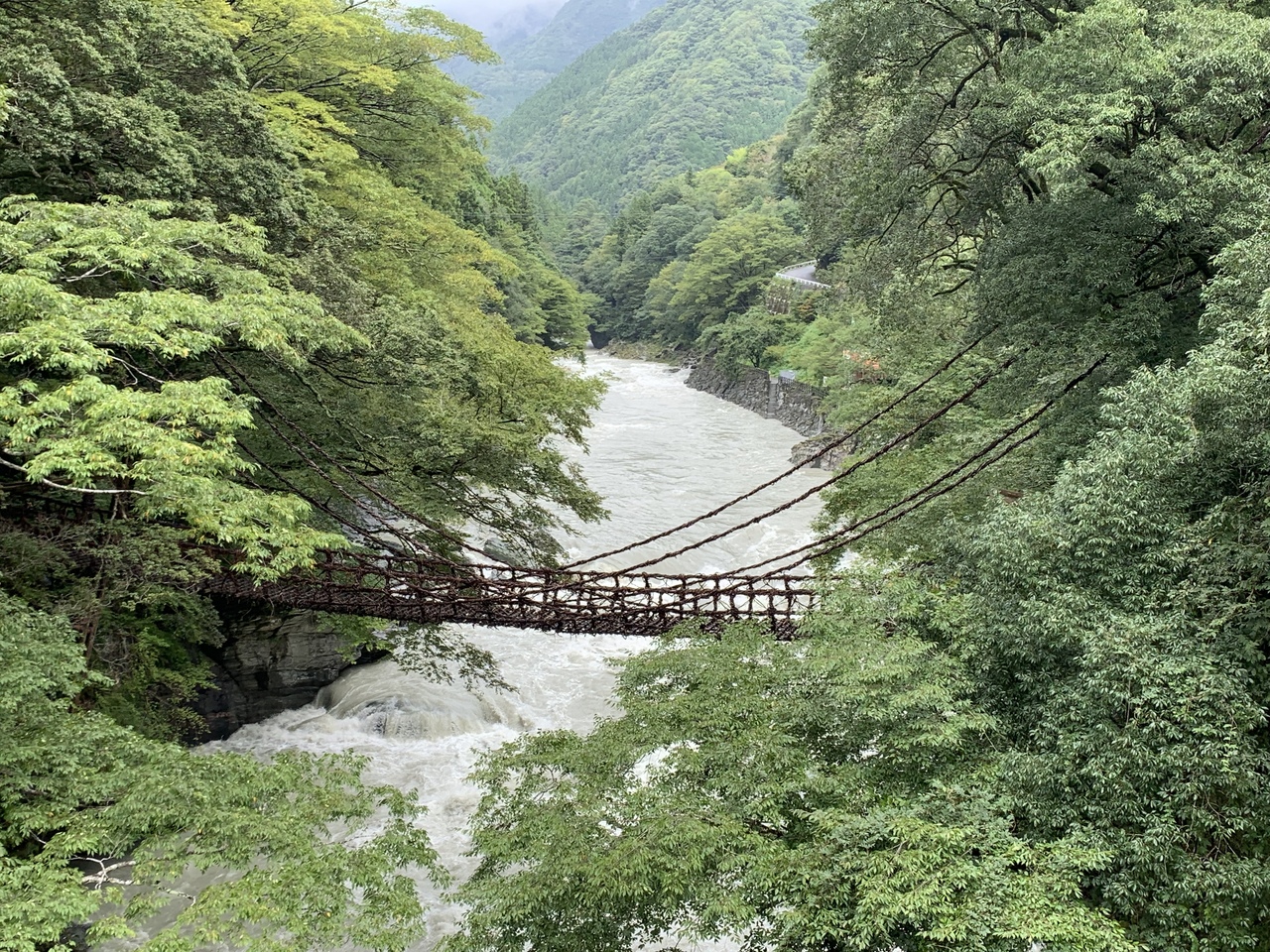 平家落ち武者伝説が残る祖谷は日本の秘境といわれて渓谷が素晴らしいです。その祖谷渓にある祖谷の「かずら橋」に行ってきました。祖谷川に架かる長さ45m幅2mのカズラで編みこまれた吊り橋です。高所恐怖症ですが渡橋料550円支払って渡ってみましたが、広めの踏み板のすき間から台風のあとの激しい水流が見えてスリル満点でした。