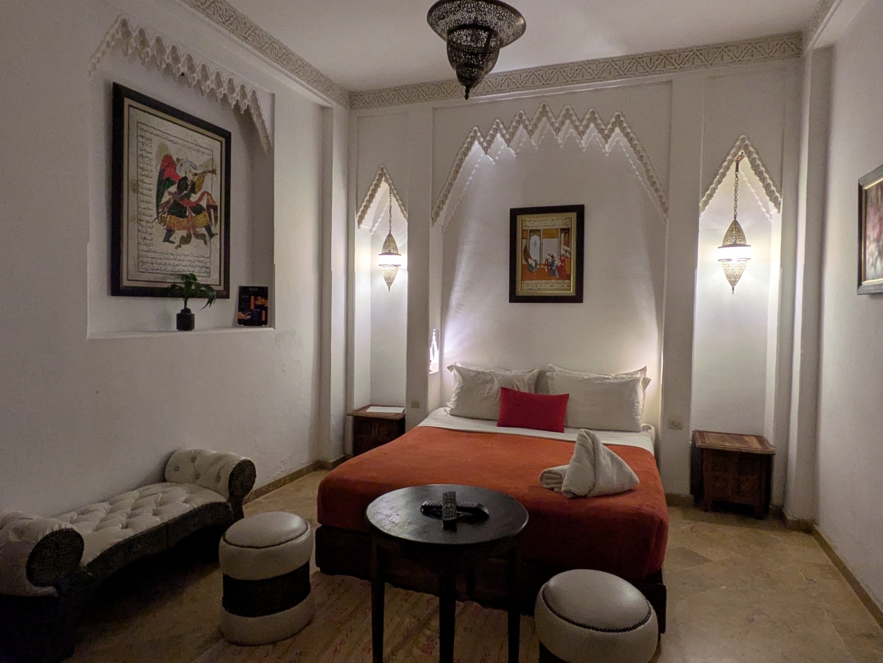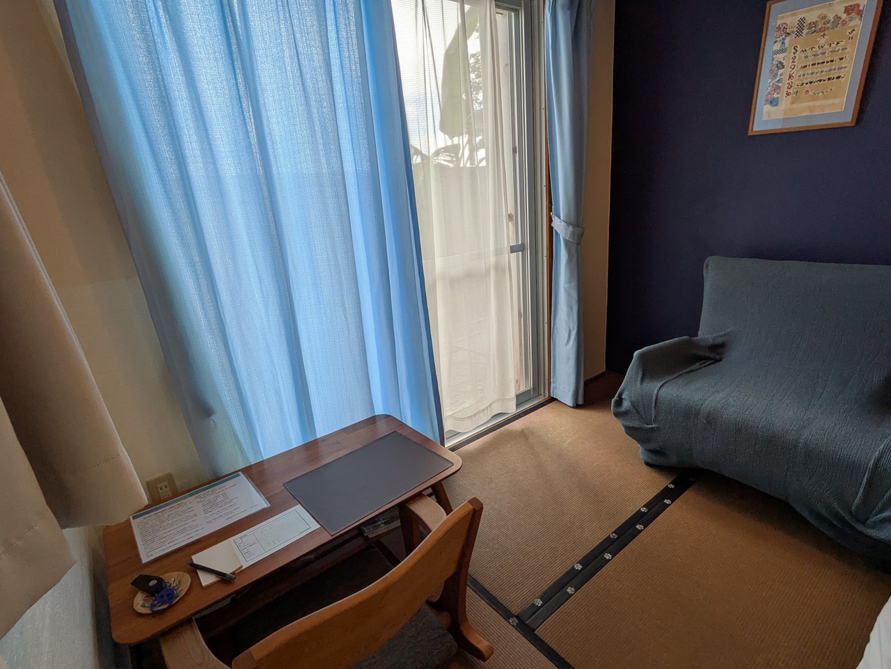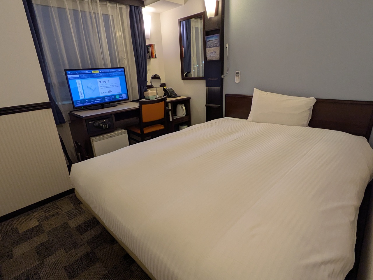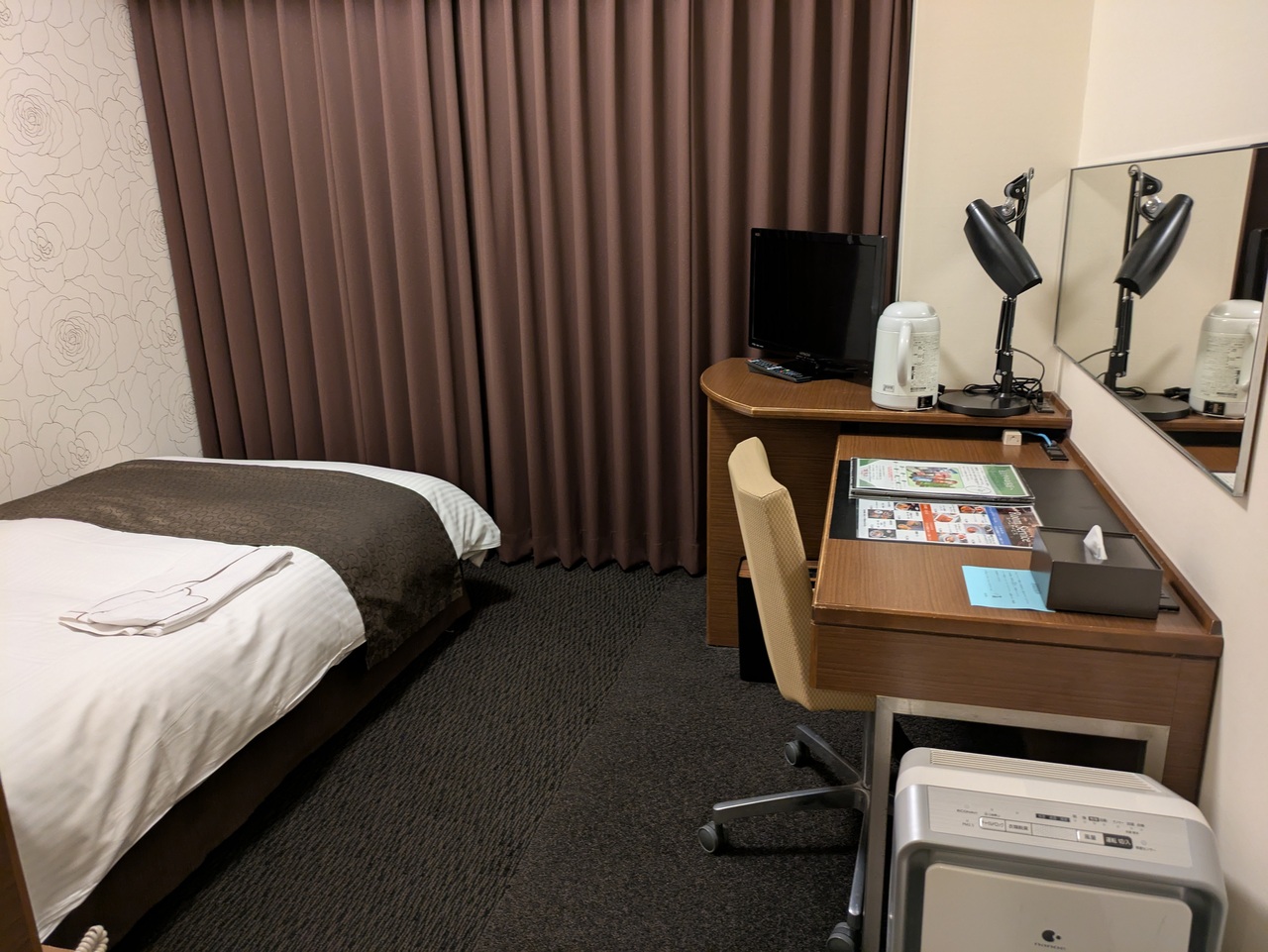 お部屋はかなり狭いです。大きなスーツケースとかあると広げられないかもです。