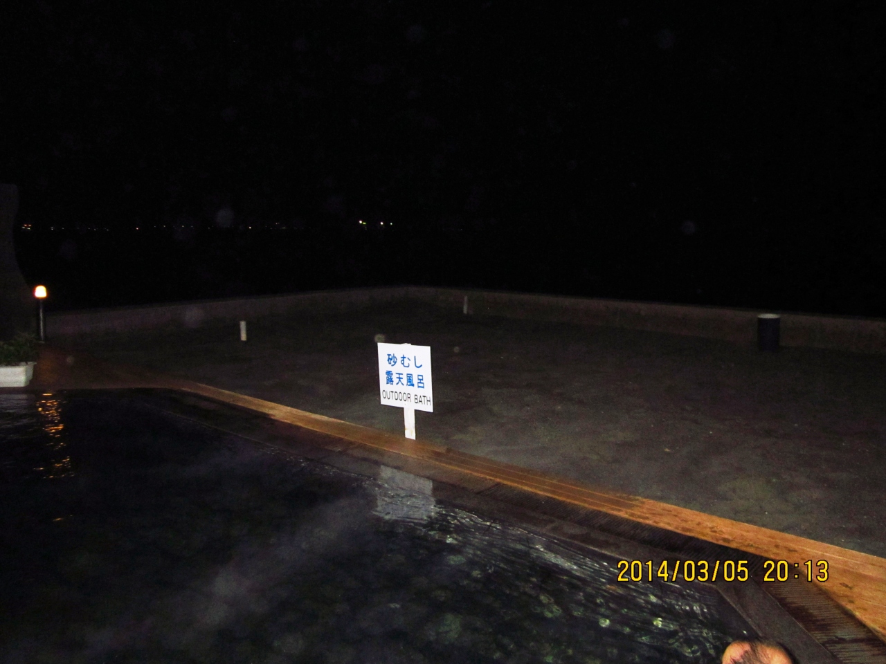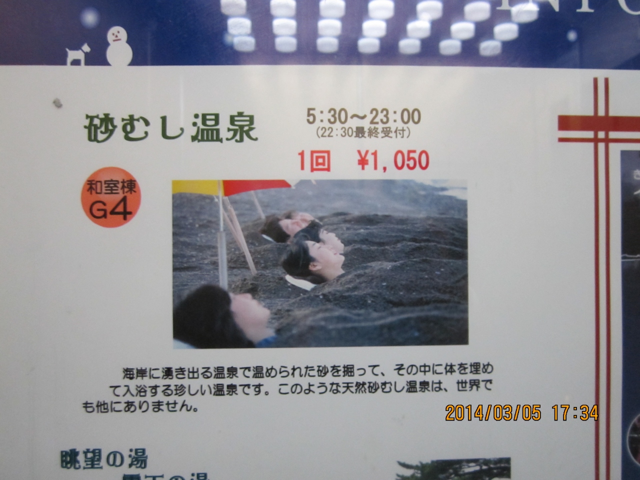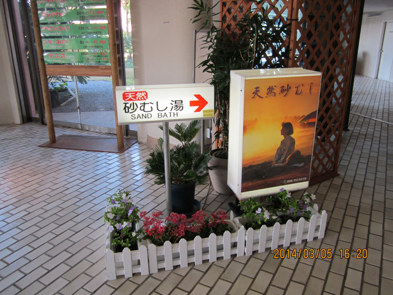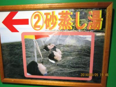 鹿児島空港から指宿までレンタカーで約2時間かかりました。指宿温泉はやはり砂むし風呂が有名で、行ったからにはぜひ体験してみたいということでは行ってみました。蒸気の充満したテントの中に浅く人が寝られるくらいの穴が掘ってあり、浴衣を着たまま頭にタオルの枕をして仰向けに寝ると、その時点で背中から足先までぽかぽか状態。すぐさま係りの人がスコップで顔だけ残して砂で埋めていきます。かかととお尻が特に熱くて15分くらいといわれましたが15分埋まっているのはつらいくらいでした。非常に温まり、汗が大量に出ました。リフレッシュできました。