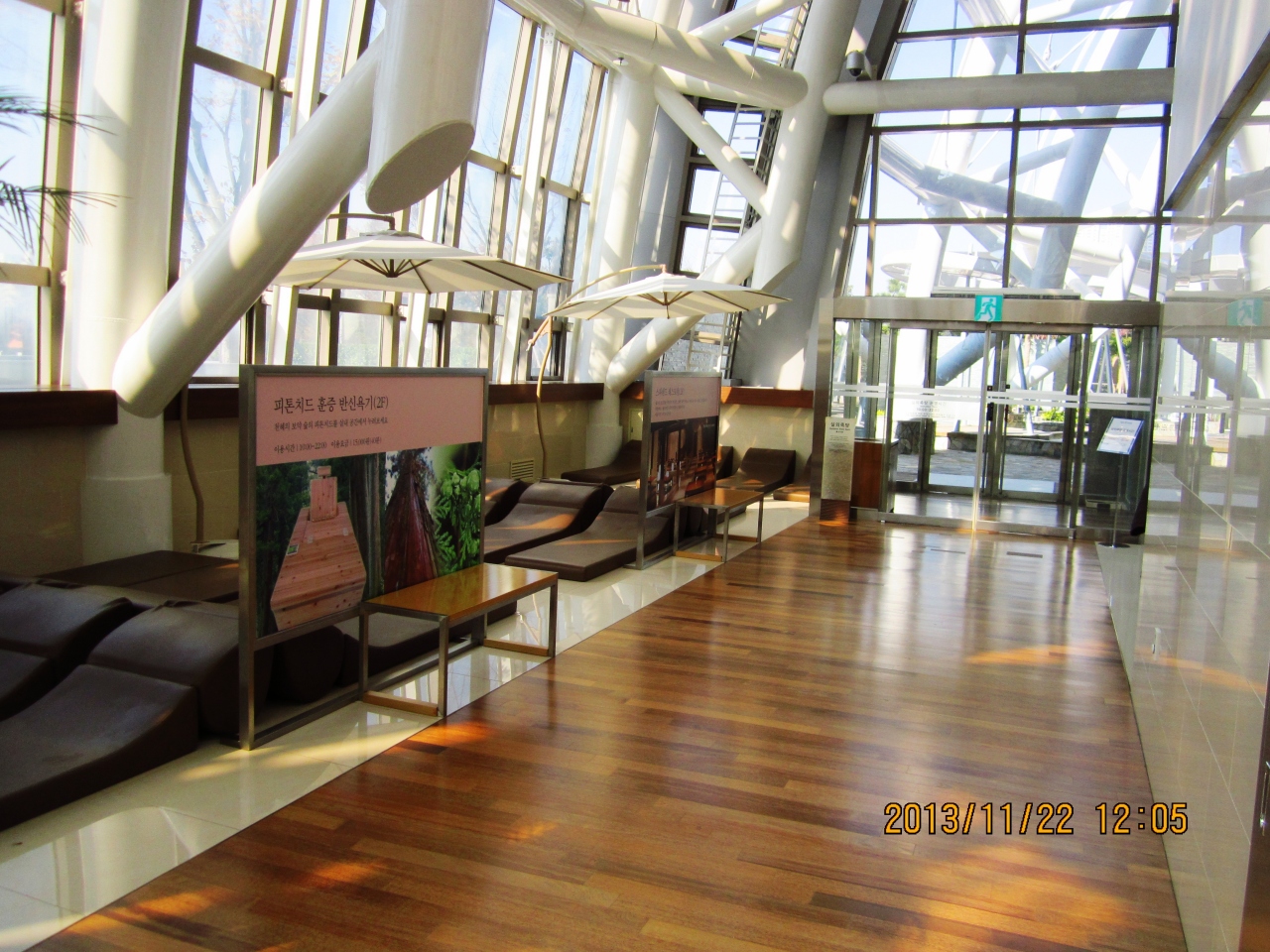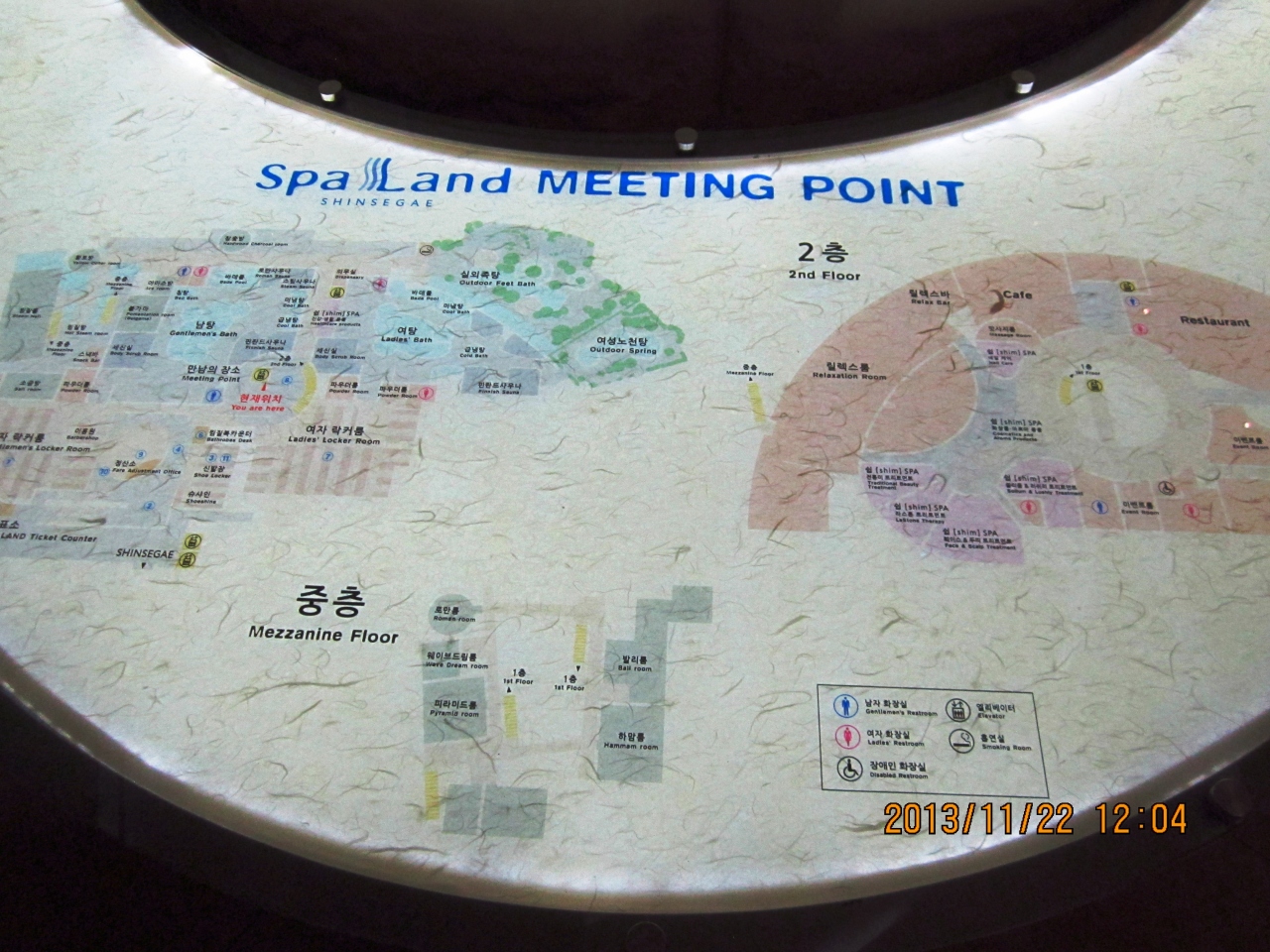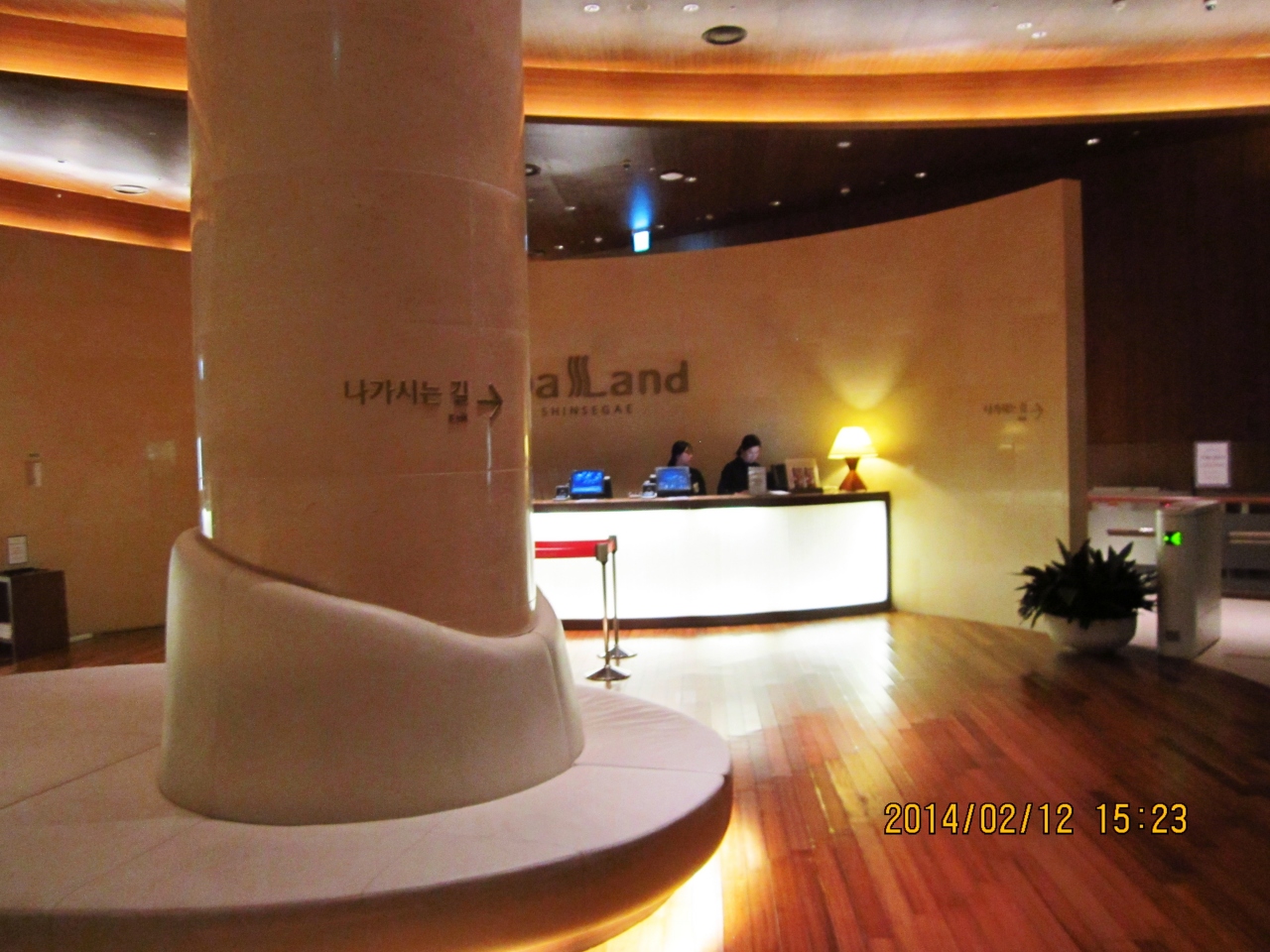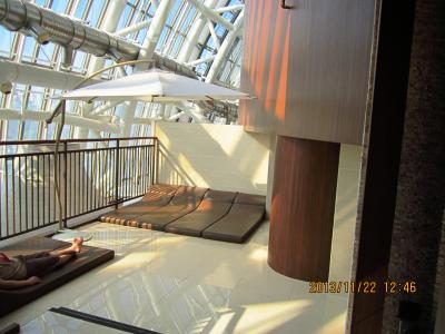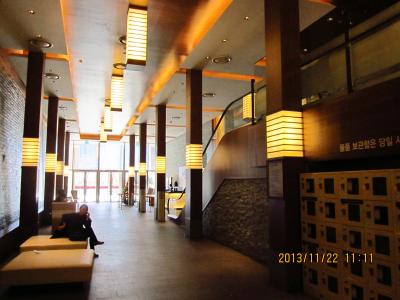 釜山へは5回目の訪問ですが、スパランドに初めて行きました。いつも西面のホテルを利用しているため、ヘウンデ方面に行ったことがありませんでした。今回勇気を持って地下鉄で行ってきました。西面からセンタムシティまで地下鉄で20分ちょっとくらいでつきます。まず新世界百貨店のインフォメーションでパスポートを見せてクーポンチケットをもらいます。20%オフで入れます。日本語は通じないようでしたが大丈夫です。支払いはクレジットカードにしました。靴を指定した靴箱に入れて鍵をとり、この鍵が施設内の財布の役割をします。中は大きくてきれいで清潔感があります。まず風呂でゆっくり汗を流しそのあと館内着で男女共用の10種類くらいあるいろいろな低温サウナのようなところに入ったり寝ころんで休んだり4時間の制限がありますので全部を試すのには時間が足りない程です。食事もできるし非常に快適に過ごせます。帰りに支払った時のレシートを持って又インフォメーションに行くとしっかりした作りのエコバックがもらえます。非常にお勧めです。