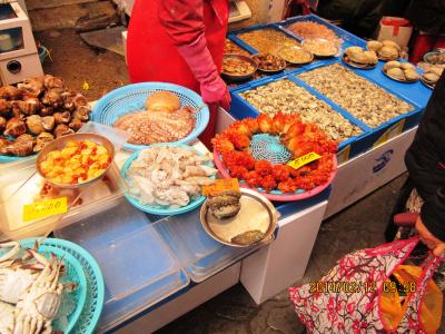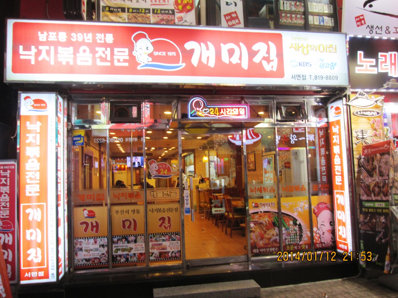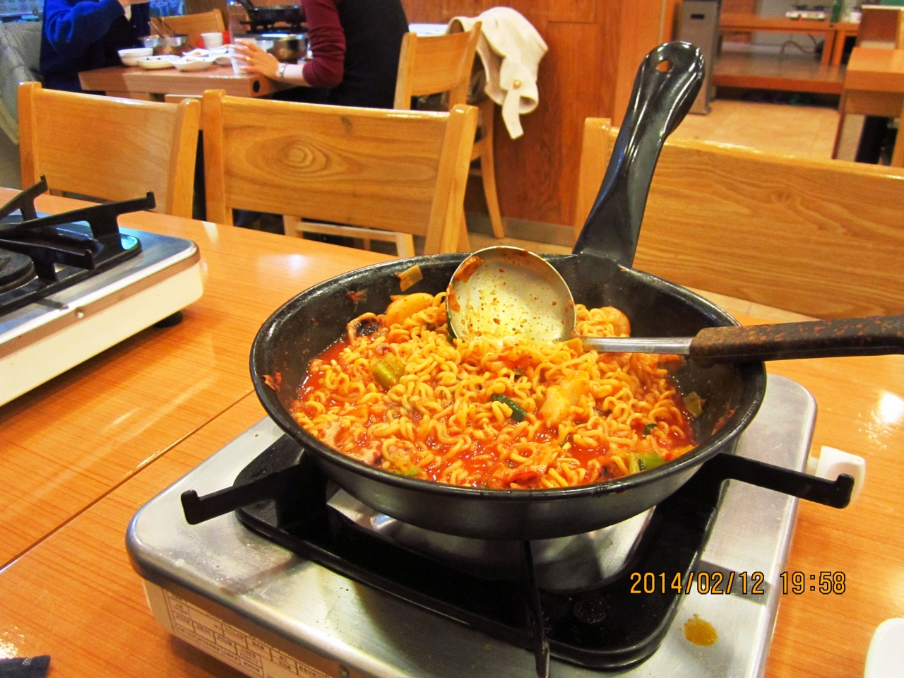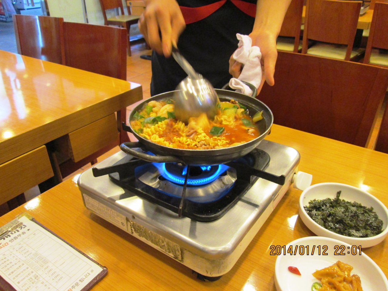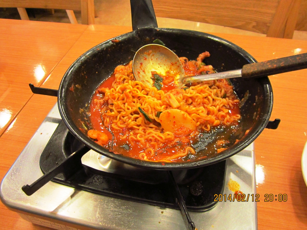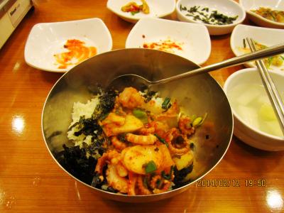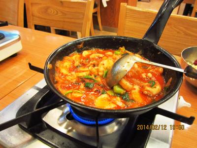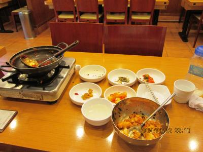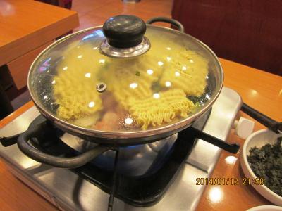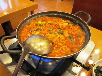 釜山に行った時には必ず寄ります。一人旅でもケンチャナヨ。注文も同じです。たこ+えび+ほるもん鍋 8000ウォンに追加でラーメン1000ウォン 一人だと(?)ご飯が別料金で1000ウォン 全部で10000ウォンでした。辛さひかえめにとお願いしても結構辛いですが、おいしいです。