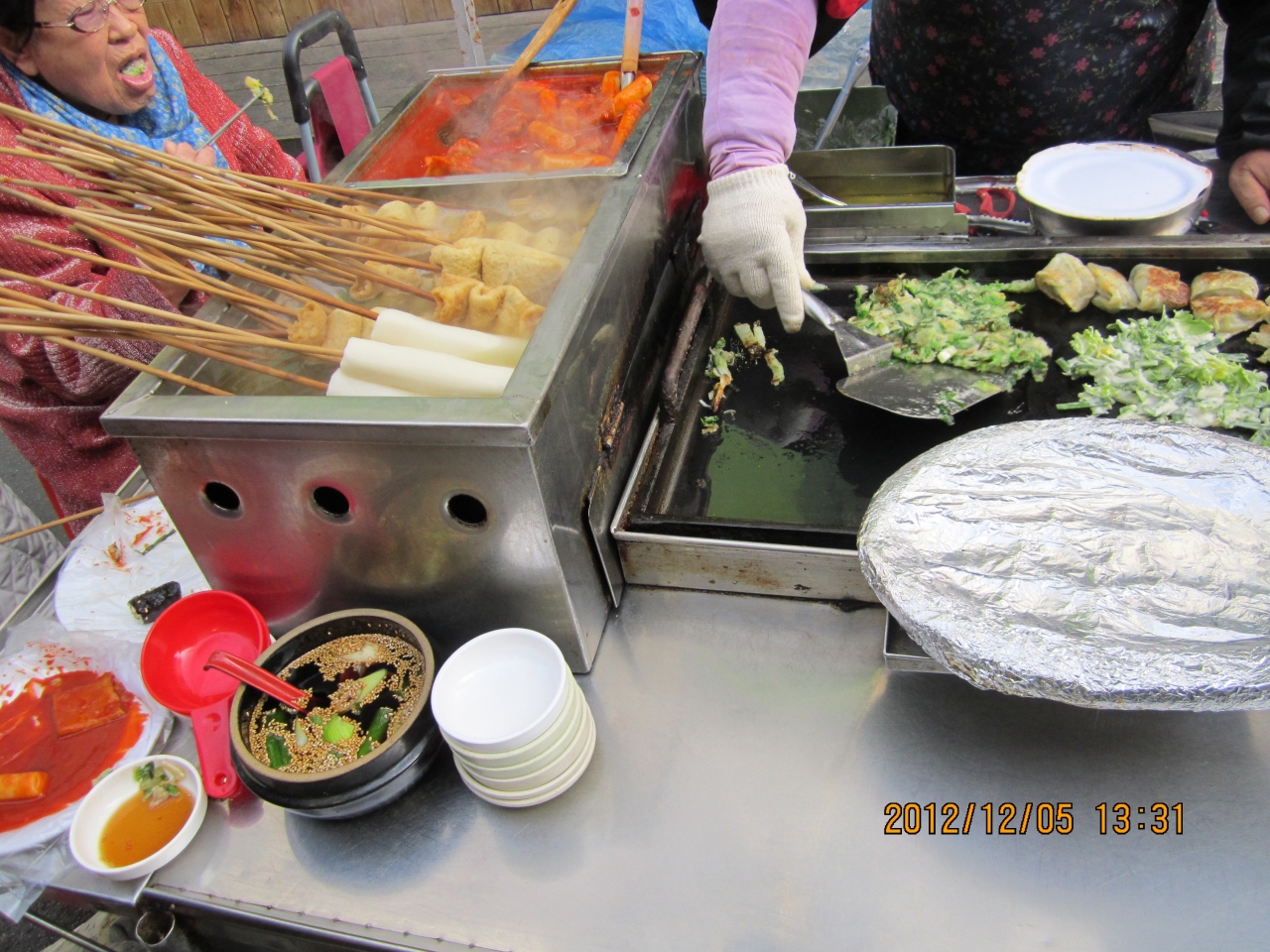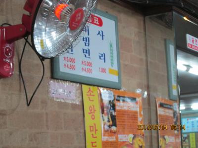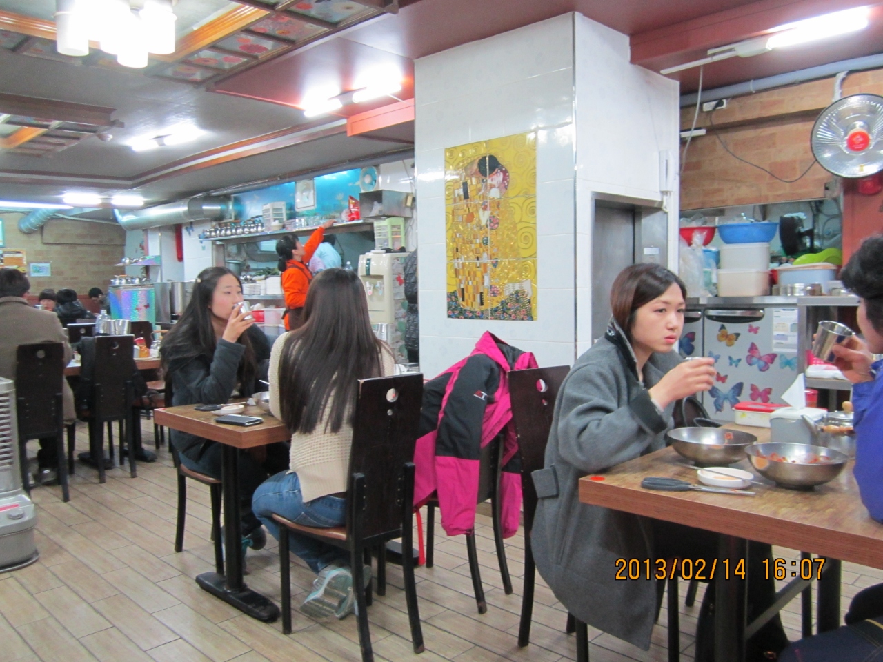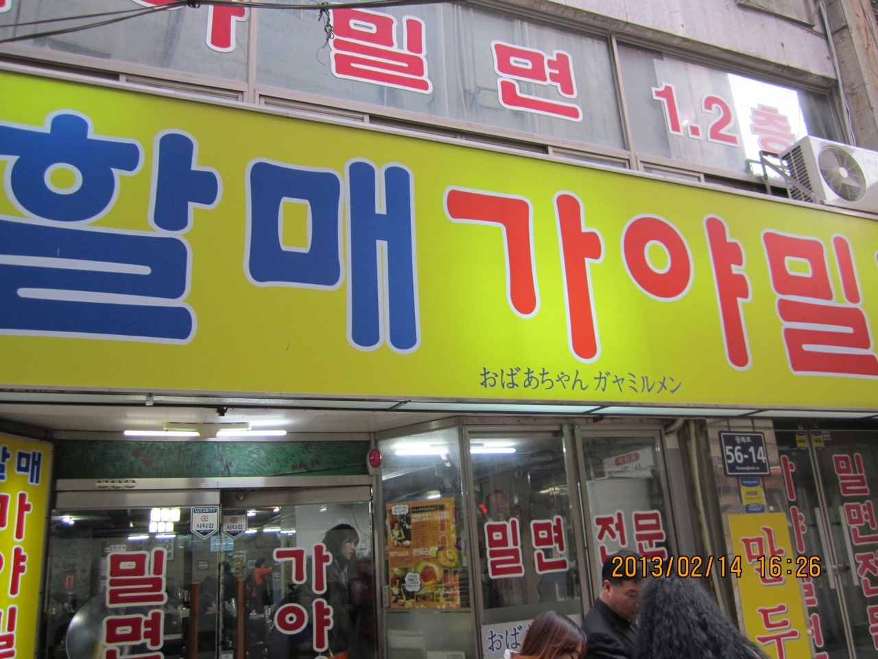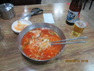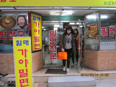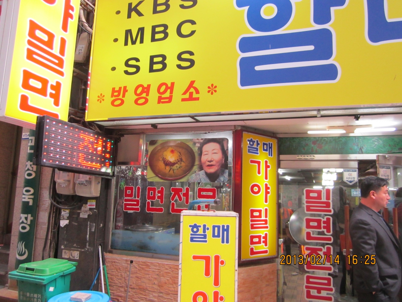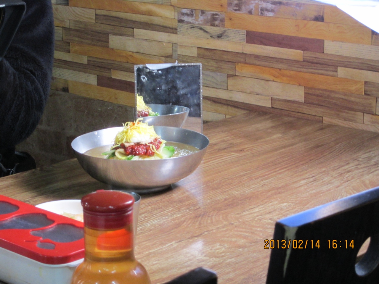 ミルミョンを始めて食べました。汁は真っ赤ですが、見た目ほど辛くなくお酢を入れてさっぱり食べられます。いっしょにやかんで出てくるコンソメみたいなスープがおいしくて冷え切った体を温めてくれます。大阪のメディアの取材の人が来ていました。撮影風景を見学できました。