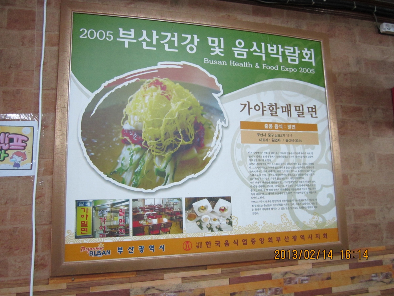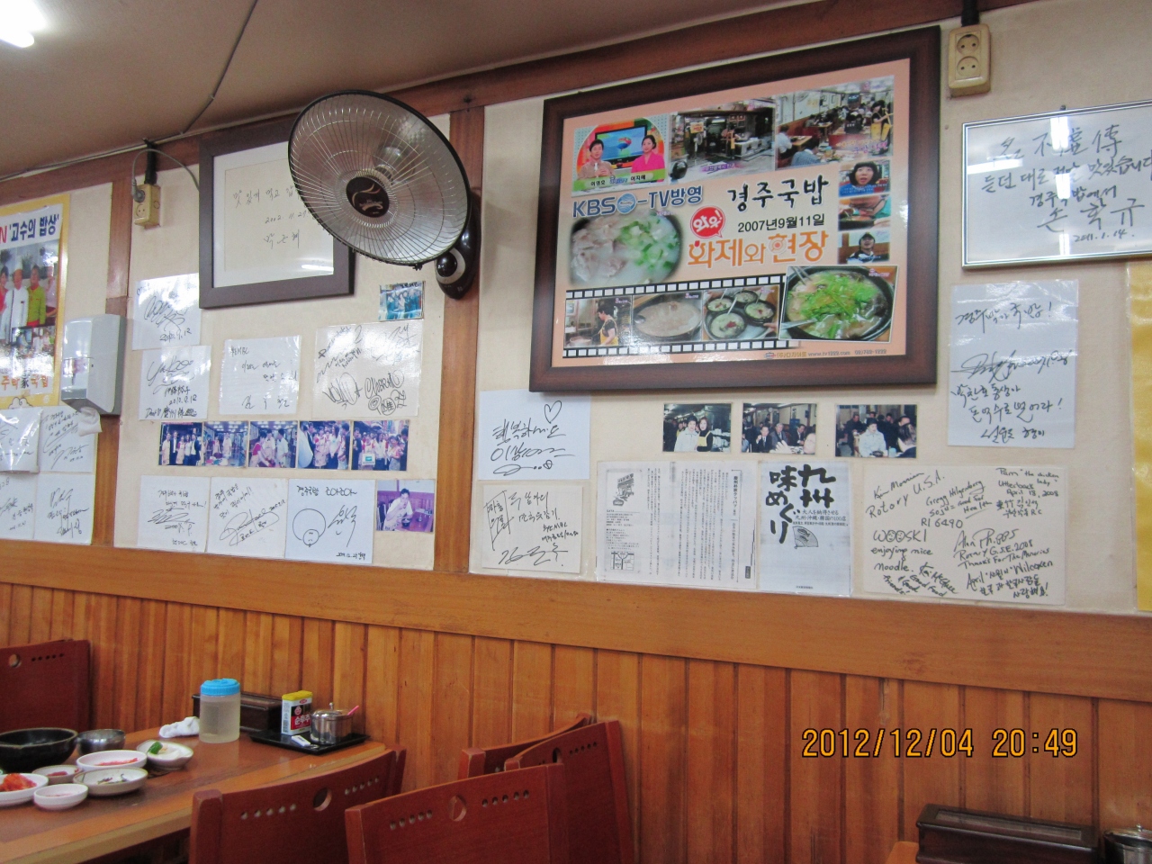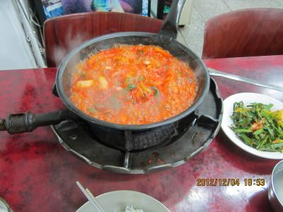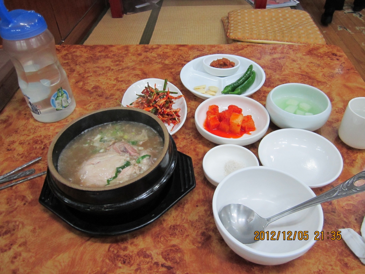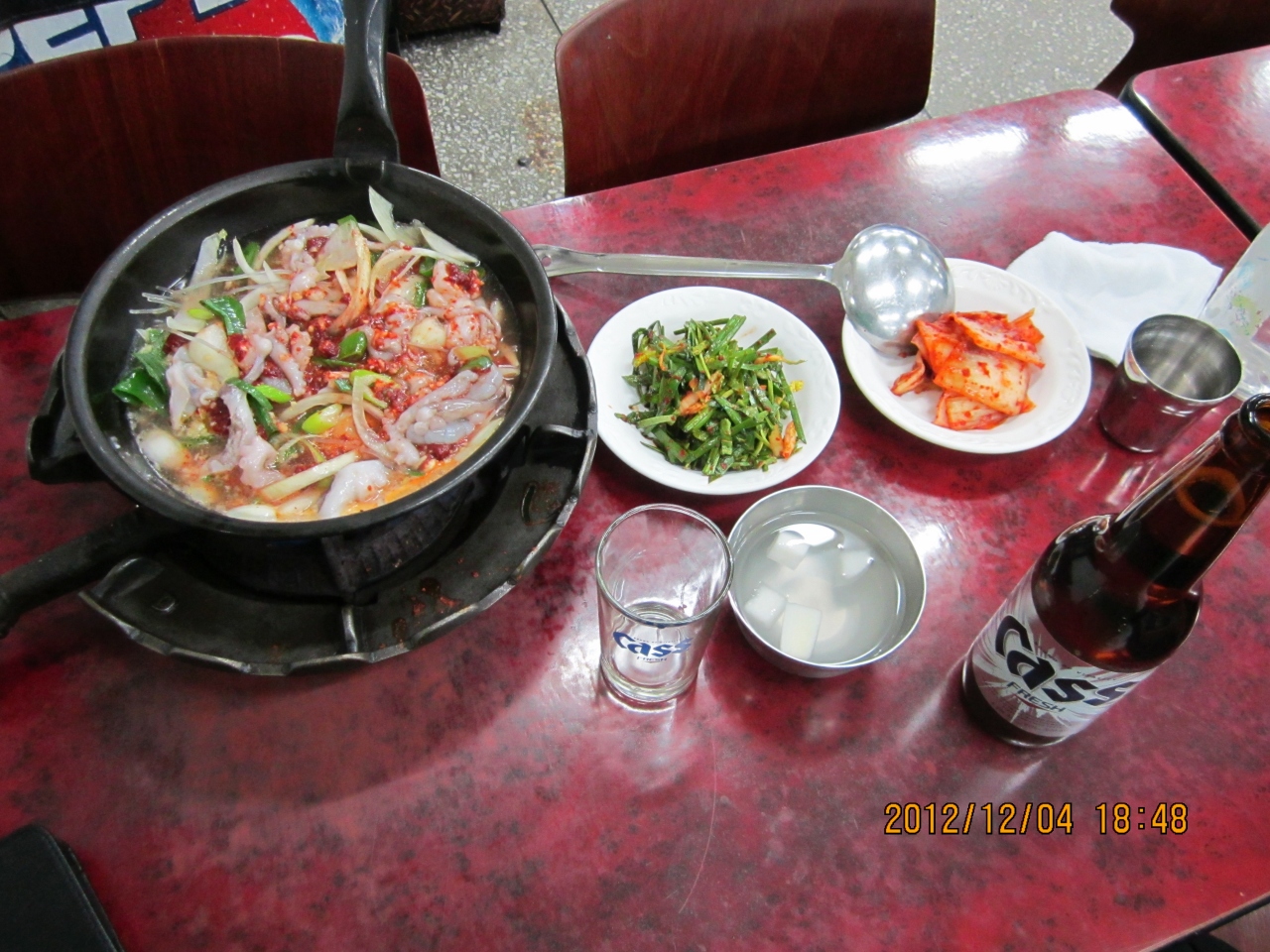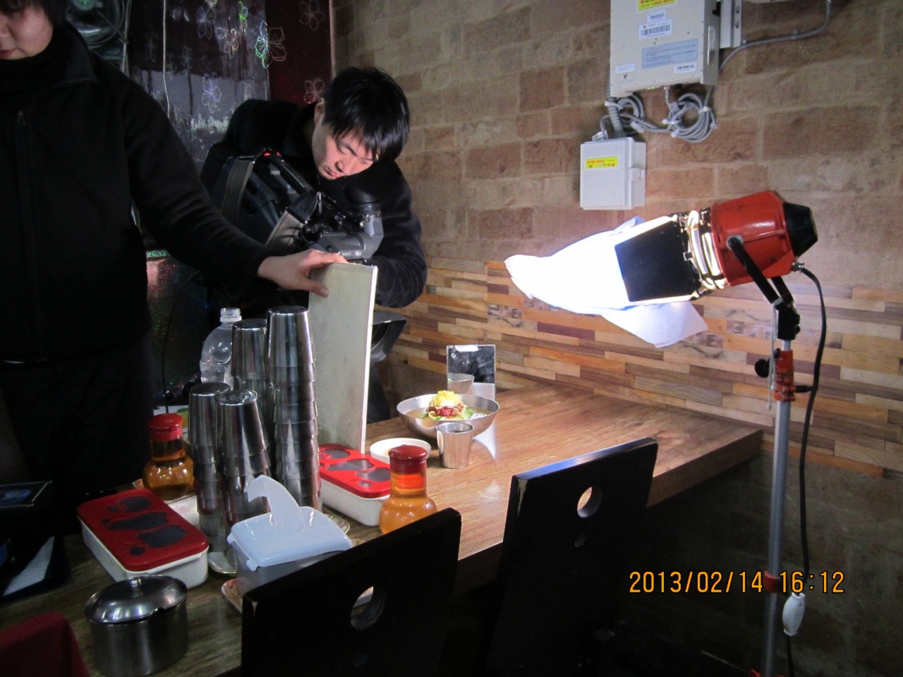 ミルミョンを始めて食べました。汁は真っ赤ですが、見た目ほど辛くなくお酢を入れてさっぱり食べられます。いっしょにやかんで出てくるコンソメみたいなスープがおいしくて冷え切った体を温めてくれます。大阪のメディアの取材の人が来ていました。撮影風景を見学できました。