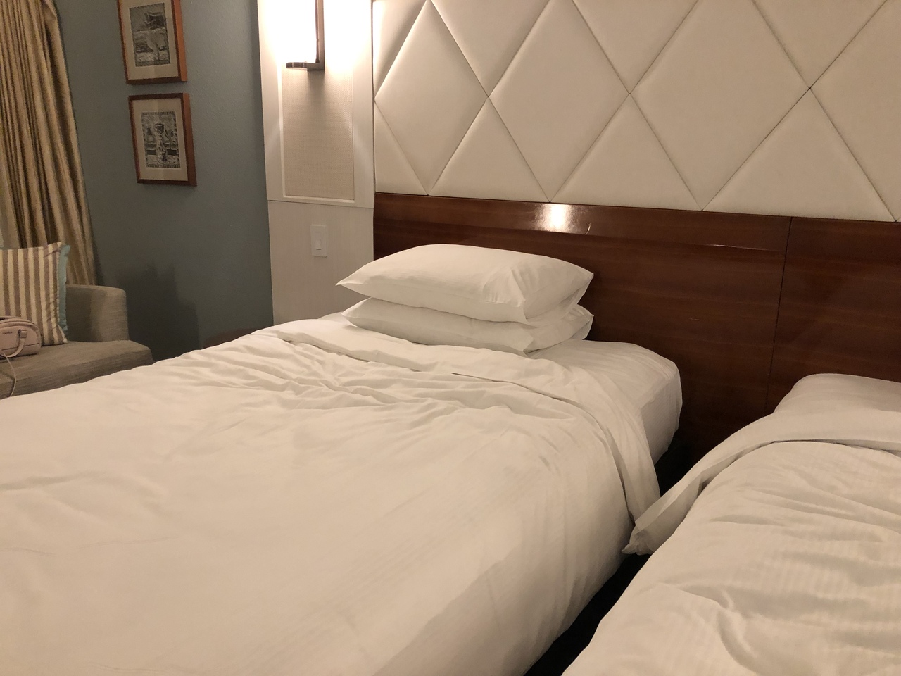 公式から予約したおかげか、部屋は最上階のツインルームに。ベッドの広さは十分で、子どもの添い寝も窮屈に感じません。