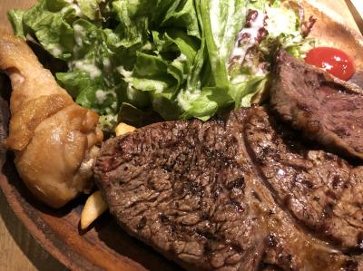 ワンプレートで、ステーキ、ポテト、サラダ、チキンが出てきます。そのほか、ライスとスープ付き。