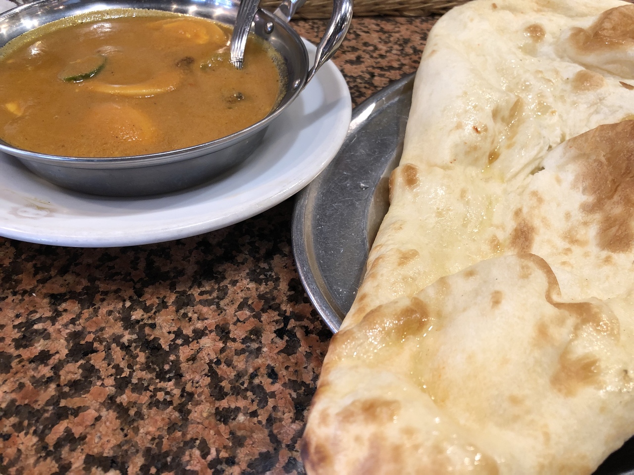本日のカレーを頼むと大きなナンとカレーが出てきます。食べた印象はいんどー!というよりなんだか懐かしい感じ?からさもなく食べやすいカレーです。- 旅行時期