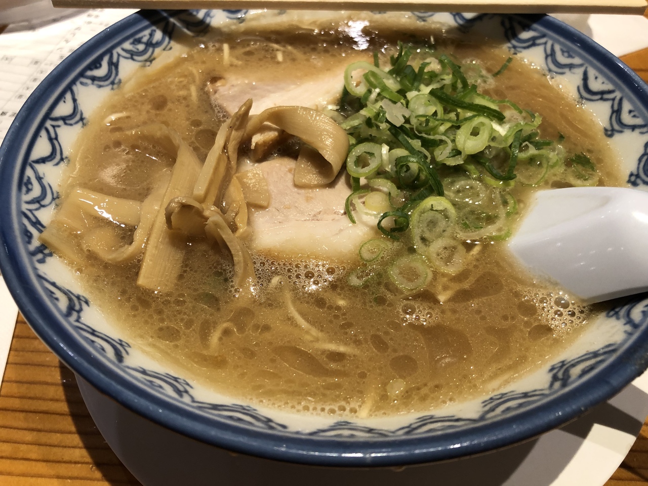 豚骨ラーメン本場の福岡でお昼に食べに行きました。平日お昼時で、お店の前は数人の列ができていました。匂いは豚骨ラーメン独特の匂いで、こってりに見えますが、食べてみると意外とさっぱりで食べやすいラーメンでした。