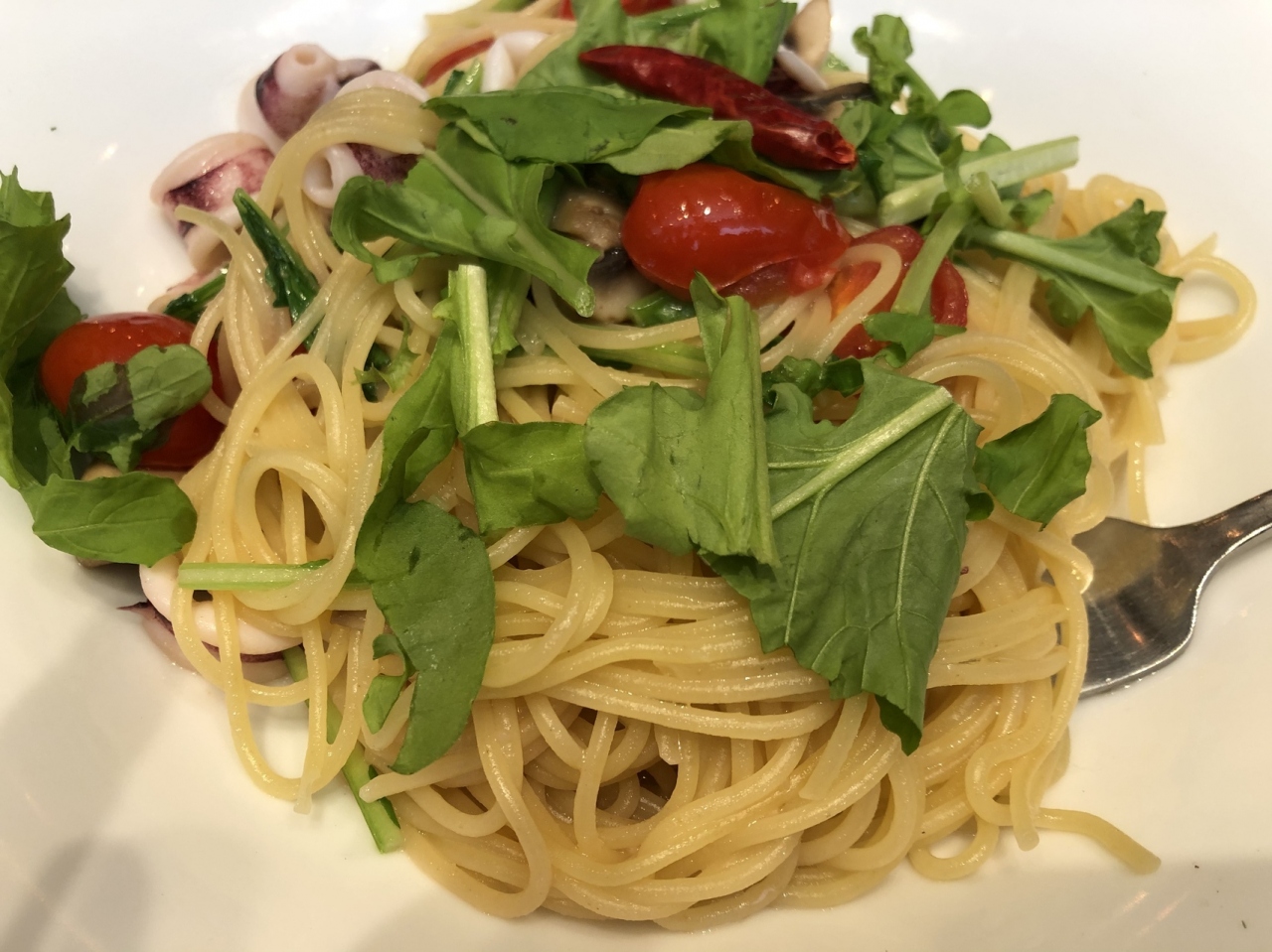 その中から、ペペロンチーノを選択。もれなくサラダが付いて、女性なら満足のボリューム。