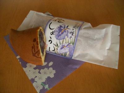 横須賀銘菓で「よこすか焼」というどらやき風の焼き菓子があります。これは衣笠に本店がある和菓子屋さんで作っているものですが、この横須賀しょうぶ園ではここでしか買えないしょうぶ園バージョンがあります。どらやき風の皮を半分に折って、中にたっぷり求肥が入った餡をくるんだものです。で、物は普段のもしょうぶ園のも同じようなのですが、皮の焼印がいつもの碇マークにしょうぶの花も押されてま~す!一つ食べたらおなかがいっぱいってくらいのボリュームがウレシイですよ。