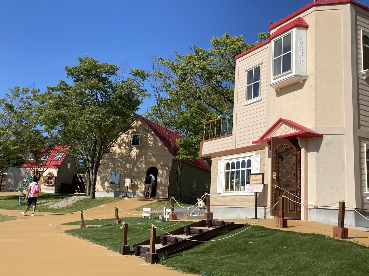 シルバニアの赤い屋根のおうちなどの建物が、人間用のサイズで何棟も並んでいます。