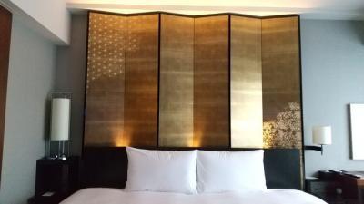 ベッドの金屏風が斬新です。スイートルームになると金屏風から銀屏風になります。