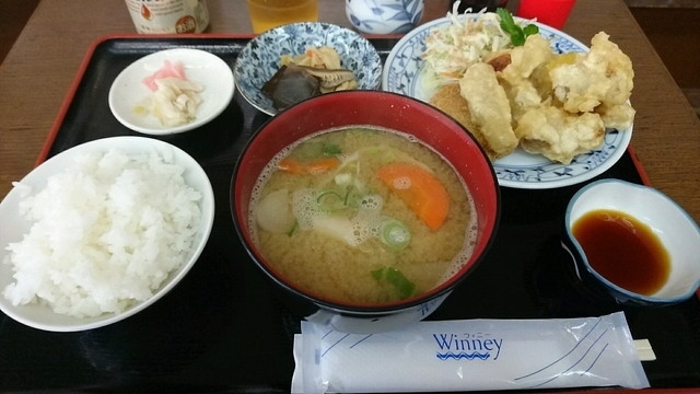 陽だまり定食をいただきました。とり天、だご汁、コロッケなどが付いていて1080円。かなりボリュームがありました。アルコールは置いていなくて、陽だまり食堂内にある売店で購入し持ち込みする形になります。