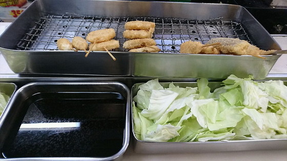 揚げ置きスタイルなので、目の前のトレーにある串カツから好きな物を食べます。