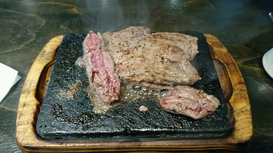 セルフのサラダとご飯&スープ。調味料も豊富で、刻みワサビとにんにくがGOODでした。焼き加減はレア。溶岩の上で好みの焼き加減にしていただきました。