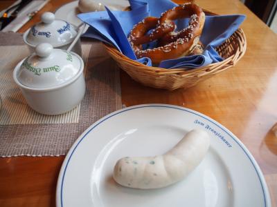 ドイツ定番の朝食メニューといえば白ソーセージ+白ビール。ということで雑誌に載っていたツム・フランツィスカーナーを訪れました。とても美味しい白ソーセージで大満足でした。付け合わせのプレッツェルと木の実のパンも白ソーセージやビールに相性抜群です。
