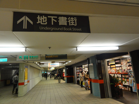 MRTひと駅分の長い地下道に本屋さんが集中、DVDやCDSHOPもありました。通路の真ん中にも台があって本を並べてある場所もあります。一見地味なお店は古本屋かと思いましたが地味なだけでした。まとめて買うとお得なようで、6本(冊)買うと500元の表示の店舗が数軒ありました。探し物があるなら便利な場所かもしれません。