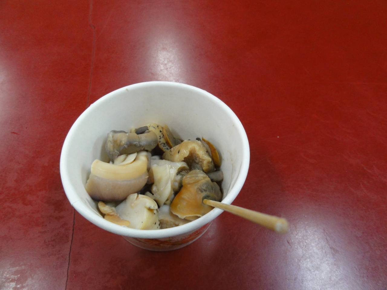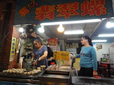店頭でツブ貝とイカを焼いてるお店があります。北海道では単にツブと呼んでましたが「ミドリガイ」という名前らしく、お店の名前もそのまま焼翡翠螺 (焼ミドリガイ) でした。焼きながら調味料を注いでましたが、多分、お酒と醤油を合わせたものだと思います。こんなところでツブ?と思いましたが、九イ分は海の近くでした。3個で100元、貝から外してカップに入れてくれました。お店の中に入って食べることも出来ます。昔懐かしい素朴な味、お薦めの一品です。
