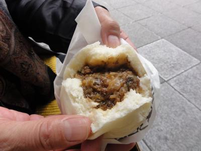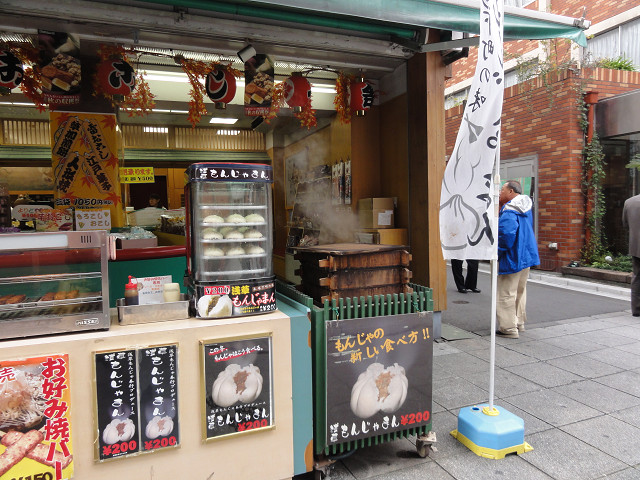 店先では「お好み焼きバー」「もんじゃまん」も売られていて、珍しさから「もんじゃまん」を食べてみました。軟らかいソース焼きそば風の具で、確かにもんじや焼きの味でした。- 旅行時期
