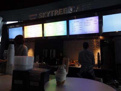 展望台で一息つけます。高い所で記念に何か食べようと、並ぶことなくスカイソフトを購入しました。飲食可能なフロアは限られていますが、他の人は入って来ないので少しゆっくり出来ます。タイミングが良ければ、展望出来る場所に入り込めます。