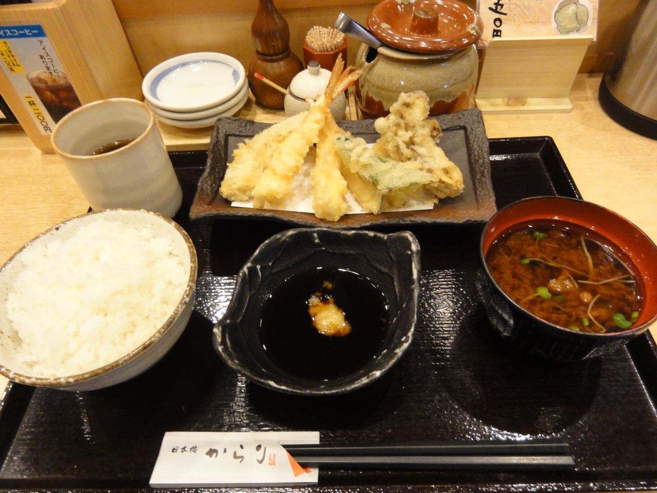 土浦のイオンショッピングモール1階にある天ぷら屋さんです。お店は広く、天ぷらを揚げる台や配膳台を中心にカウンターとテーブル席が設けられ、回転寿司のような感じの造りになっています。海老天膳(\980)は、海老2尾・茄子・かぼちゃ・しめじ・ピーマンの天ぷらにご飯、赤だしが付いていました。眼前で揚げた天ぷらが美味しくて、単品でいかとホタテを追加(1個\150)しました。無料でご飯のおかわりも出来るそうです。1人でも気軽に入れました。