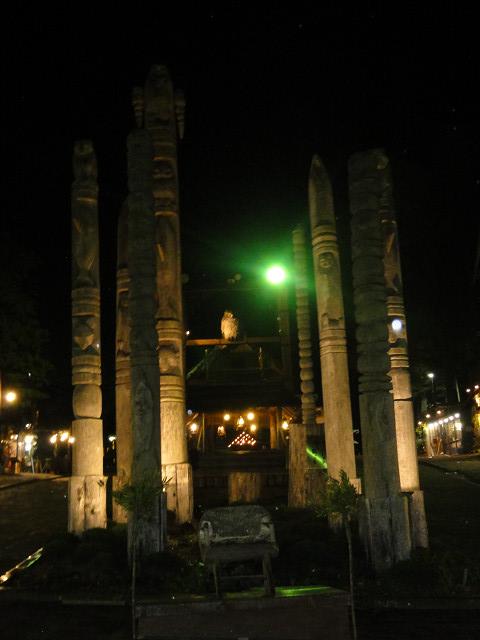 宿泊したホテル「御前水」から徒歩5分、温泉街の外れにあります。大きな木彫りのフクロウのアーチがあり、店構えも独特な土産物店が軒を連ねてます。夜、遅かったせいか、人通りもなく、9時開演のアイヌシアターの案内だけが響いてる感じでした。