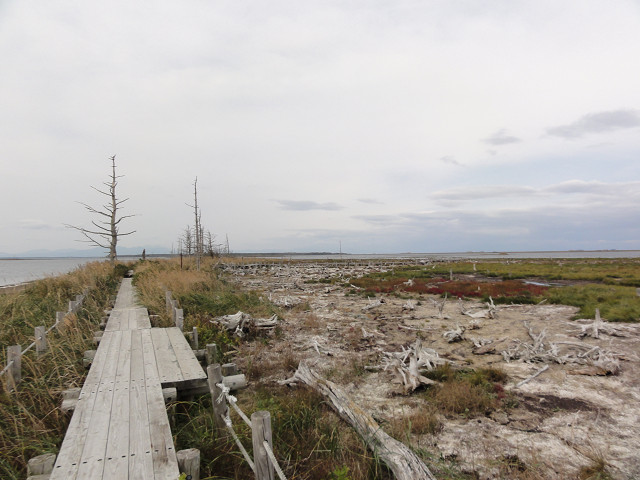 何の知識もなくガイドさんの話を聞くまでは、野付半島に居る「トド」を見に行くと思ってました。塩害で枯れたトド松を見に行くと知ったのはバスの中でした。聞けば、楢の木が枯れたナラワラもあるそうです。