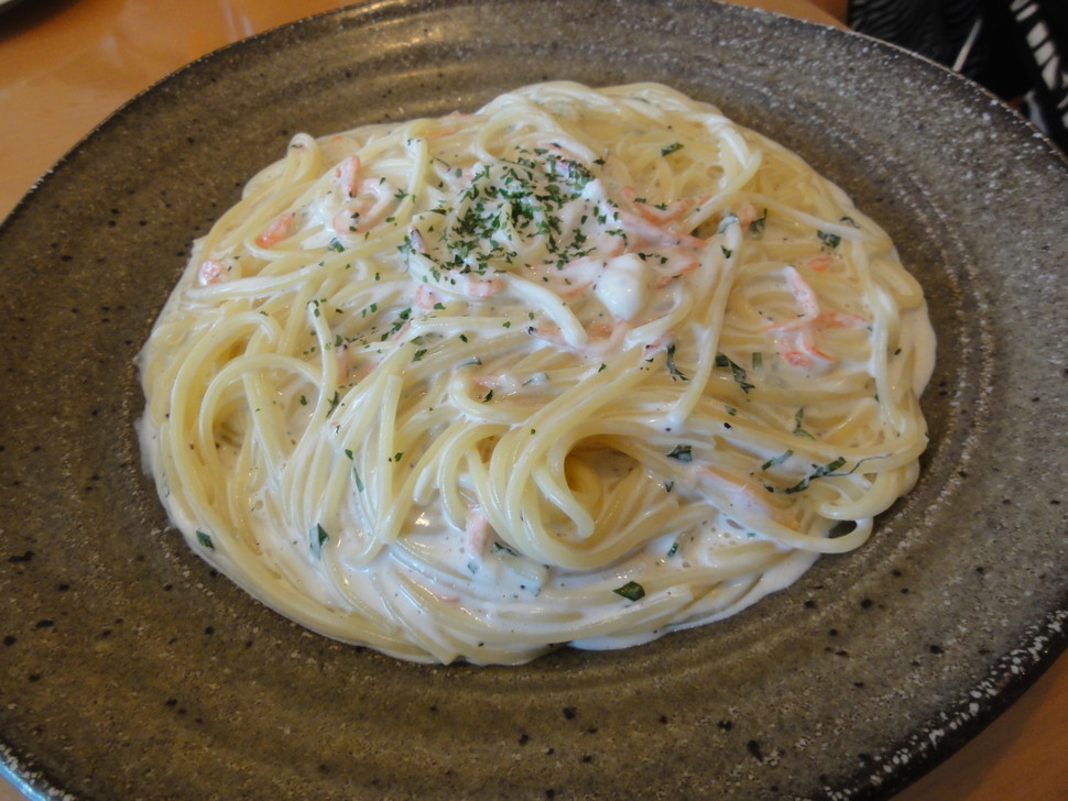 パスタランチもありますが、お魚も付いたメニューでちょっと贅沢しました。パスタは桜エビと大葉のクリームパスタ、お魚にはインゲンやブロッコリー、パプリカ、筍、トマト、じゃが芋等添えられ、どちらもボリュームいっぱいでした。前菜、パン、スープ、魚料理、パスタ、飲み物、デザートのセットで、口直しにと柑橘のゼリーが出されました。その後にデザートが運ばれて来ました。嬉しい心遣いです。