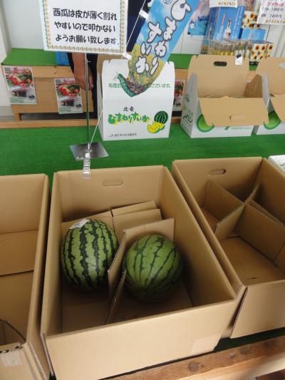 ひまわりの里、北竜町の道の駅に隣接された農産物の直売所です。日曜の午前中立ち寄りました。米やパン、お菓子、スイカやメロン、茄子やズッキーニ、大根、人参、インゲン他新鮮野菜類が並んでました。人気はメロンと皮が薄く実が黄色のひまわりスイカで、地方発送するのか箱で買ってく人が多かったです。