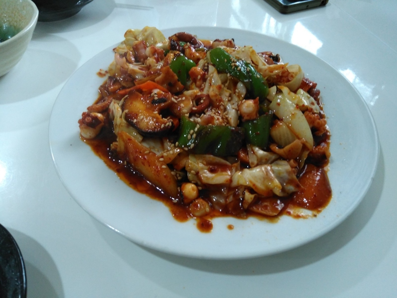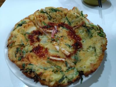 韓国風中華料理のお店と聞き行ってみました。キムチチャーハンや冷麺、ビビンバ等ありました、ランチのセットメニューはなく、2人で3品にご飯を食べました。ご飯はお代わり自由な感じです。海鮮チジミとユッケジャンスープ、タコの炒め物を食べました。チジミにはイカが入り厚かったです。