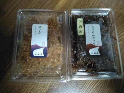 佃煮の専門店です。久しぶりに行くとショーケースの商品がコロナ対策なのでしょうか、どれも1個のみの陳列でした。ちりめんかつおは国内産、切いかの方は中国産のいかでした。いかの方は量が少なくなった分、価格も安くなった気がしました。