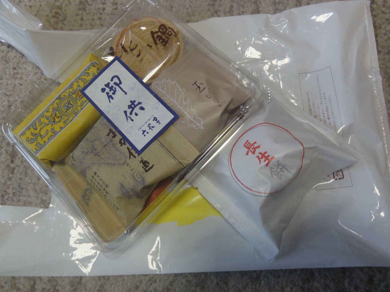 お彼岸が近ったせいか色々なお菓子が入ったお供えセットがありました。かなりしっかりしたケースで、これなら潰れないと購入しました。その話をレジですると、お供えじゃなくとも対処出来ると言われました。次回はそうしましょう。賞味期限も2週間位あり彼岸時に利用できました。