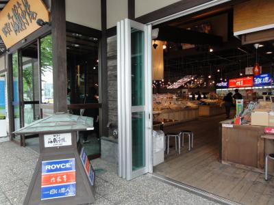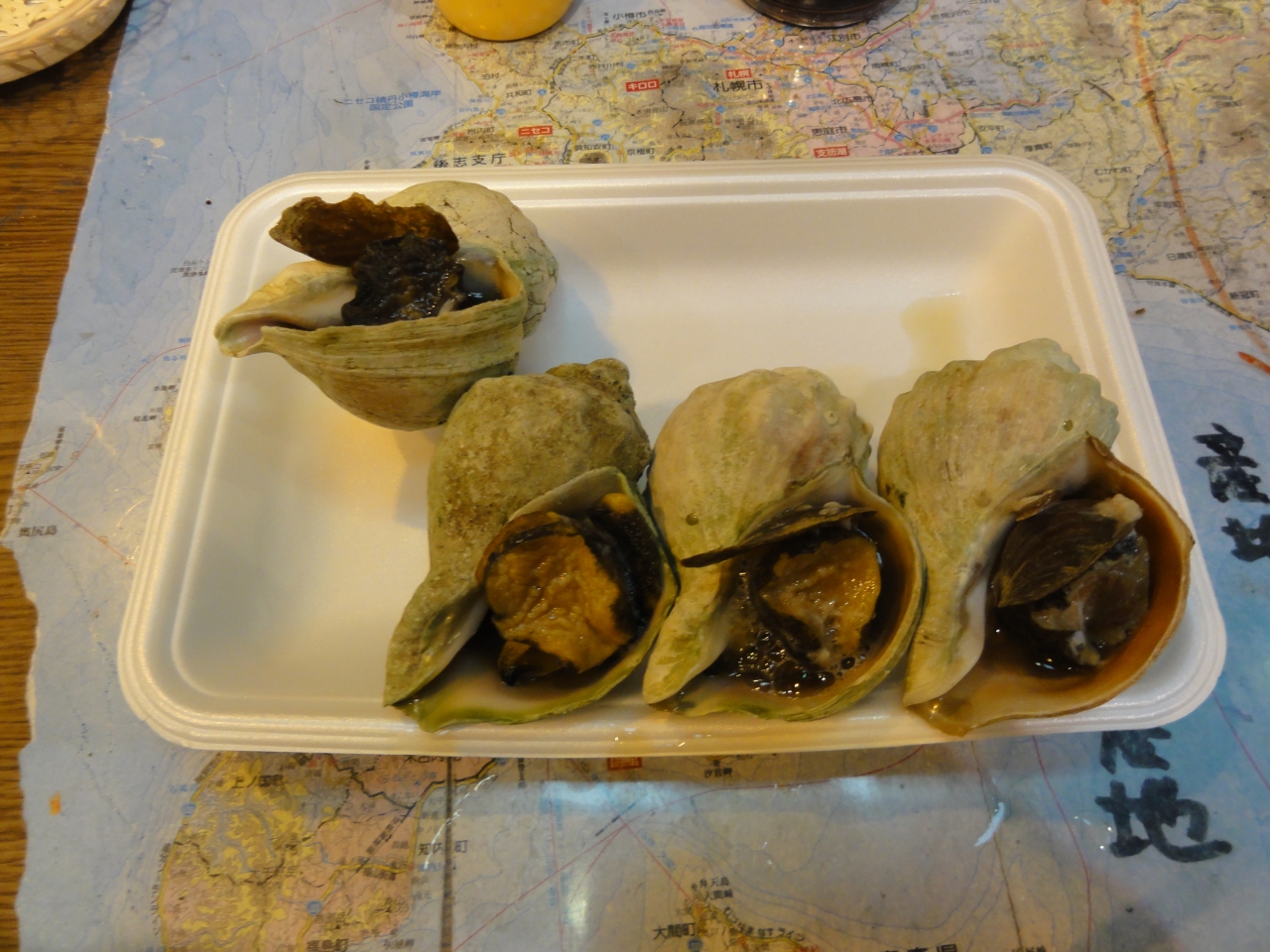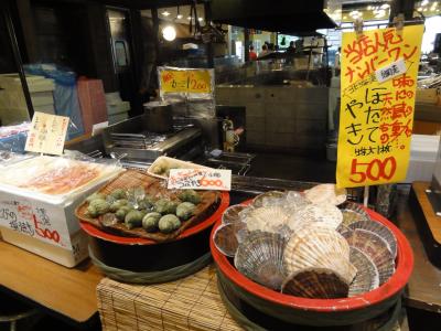 五稜郭と西波止場にある海鮮市場に生ものはなかったのですが、本店は蟹やホタテ、北寄貝、イカ等魚介類を扱ってました。イートインのコーナーでは、貝を焼いてくれたり、イカや魚をお刺身にして売っています。焼きツブを食べてみました。