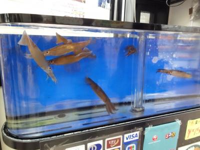 活イカの釣り堀って何?と市場に入ると、水槽に泳ぐ小振りのイカが目に入りました。引っ掛ける感じでイカを釣り上げます。イカは持ち帰り出来ないとの事で、それで¥740は高いでしょと周囲を見ると、食べてる人がいました。釣り上げたイカはバケツに入れられ、調理待ち、次々お刺身になりました。