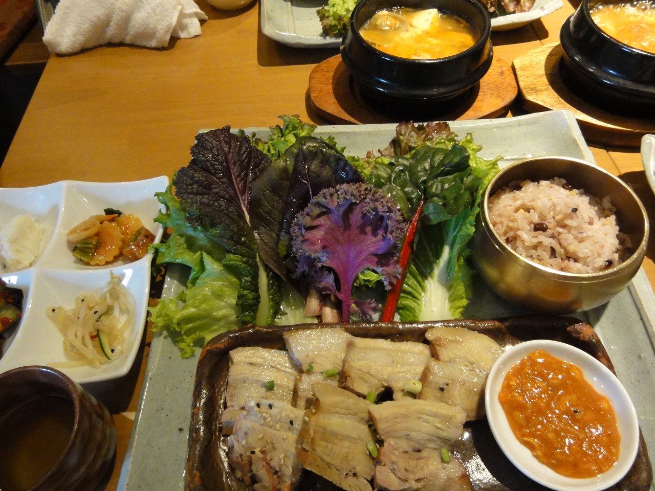 新大久保駅を出て右側、新宿方面へ線路沿いに歩くとすぐお店があります。線路側が正面入り口ですが、裏側にも入口があって、待ち合わせた友とお互いに別な所で待ってて大笑いでした。店内は落ち着いた雰囲気で静か、ランチタイムは全席禁煙で良かったです。日曜でしたがランチメニューがあり、ポッサムサンパ(包み野菜)を食べてみました。前菜の副食4種類、雑穀米のご飯にたっぷりの野菜、チゲ、軟らかい肉、どれも美味しく頂けました。安心して人に紹介出来るお店です。渋谷ヒカリエ、新宿高島屋にもお店があるそうです。