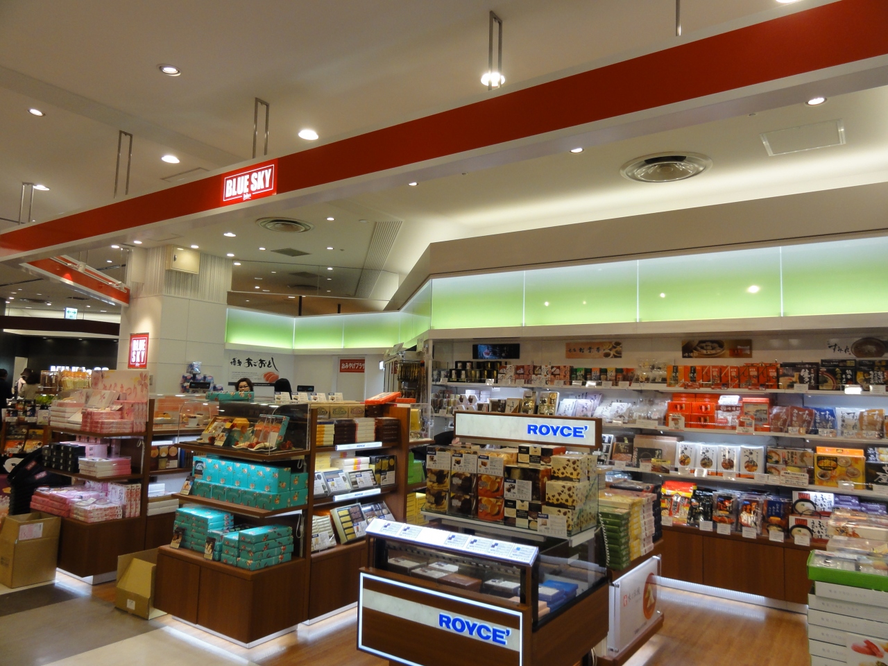 国際線側にあるBLUE SKYです。東京土産のお菓子だけじゃなく、北海道のロイズの生チョコや博多の明太子、築地のうなぎ、札幌のラーメン、魚の干物等もありました。さすが日本国内飛んでるJALのお店と思いました。ロイズ製品は種類も豊富でした。