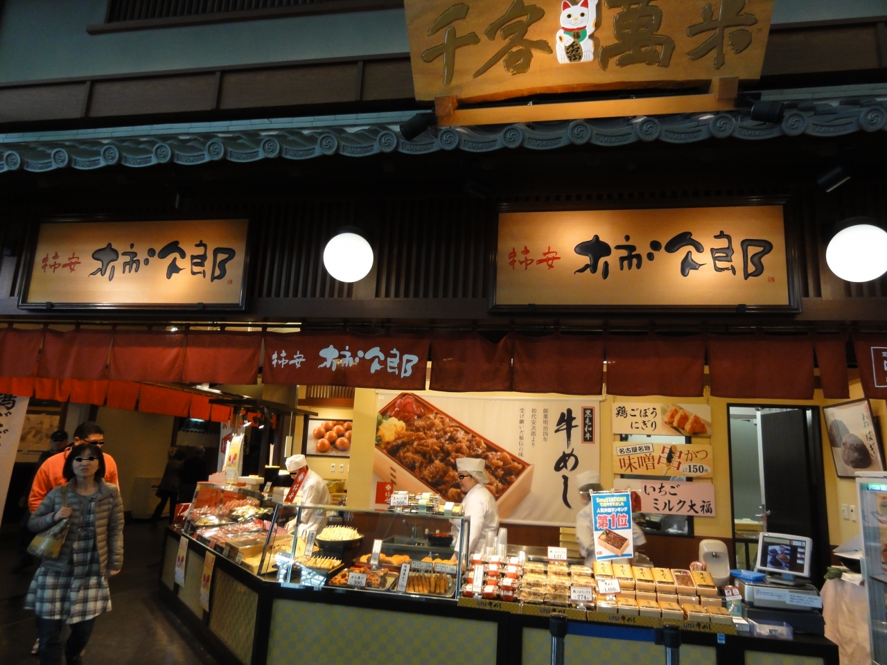 ちょうちん横丁にあるお店で、空港中央のイベントプラザに面しています。鶏ごぼうのおにぎりや牛肉弁当、コロッケや味噌カツの他にお饅頭やお団子、入ってる苺が見える苺大福等のスィーツも色々ありました。人気はちょっと高い牛肉弁当の様でした。店先にあるテーブルで買ったばかりのお弁当やスィーツを食べてる人もいました。味噌カツってどんな味?と味噌カツを食べてみました。少量ならいいですが、多くは食べられない深い味でした。