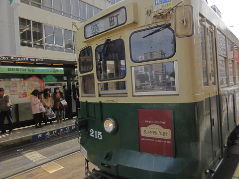 前回はツアー、今回はフリーで2回目の長崎でしたが、空港から市内にバスで来てしまえば、後は路面電車で自由自在でした。1回¥120の料金も安く、一日乗り放題の¥500券もありましたが利用しませんでした。駅間も場所によっては短くて歩ける感じでした。車両は新旧様々、乗り継ぎ券を築町で貰えば¥120で主な観光地まで行くことが出来ます。