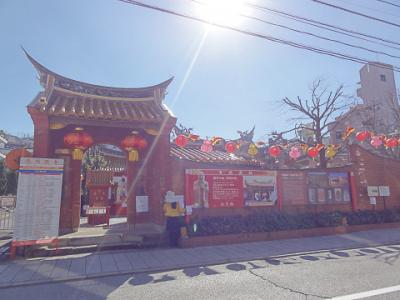 新地中華街から徒歩10分とガイドマップに書いてありましたが、市内見学も兼ねて思案橋から路面電車に乗りました。大浦天主堂下から徒歩3分に孔子廟はありました。ランタンフェステバルの会場周遊スタンプラリーの一つになっていました。春節を祝うランタンが飾られていても違和感ないところです。日本に孔子廟があることを意識してなかったので立派な孔子廟にびっくりでした。