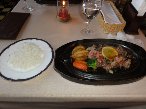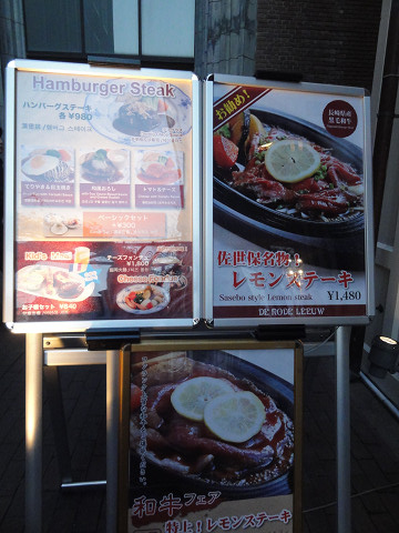 佐世保名物のレモンステーキは、米兵が食べてるステーキを日本人が食べやすいよう、さっぱり味を追求した結果生まれたものだそうです。ハウステンボス内に何軒か食べられるお店がありましたが人気店と言うことで入りました。イルミネーション点灯前のちょっと早い時間だったので、すぐ席に案内されました。アイスを食べた後だったので、レモンステーキにベーシックセット(パンorライス+スープ)で注文。運ばれて来たレモンステーキは、スライスされた牛肉二ステーキソース、上にレモンの輪切りがのっていました。味だけでなく肉も食べやすくスライスされてました。熱々、さっぱり味で美味しかったです。