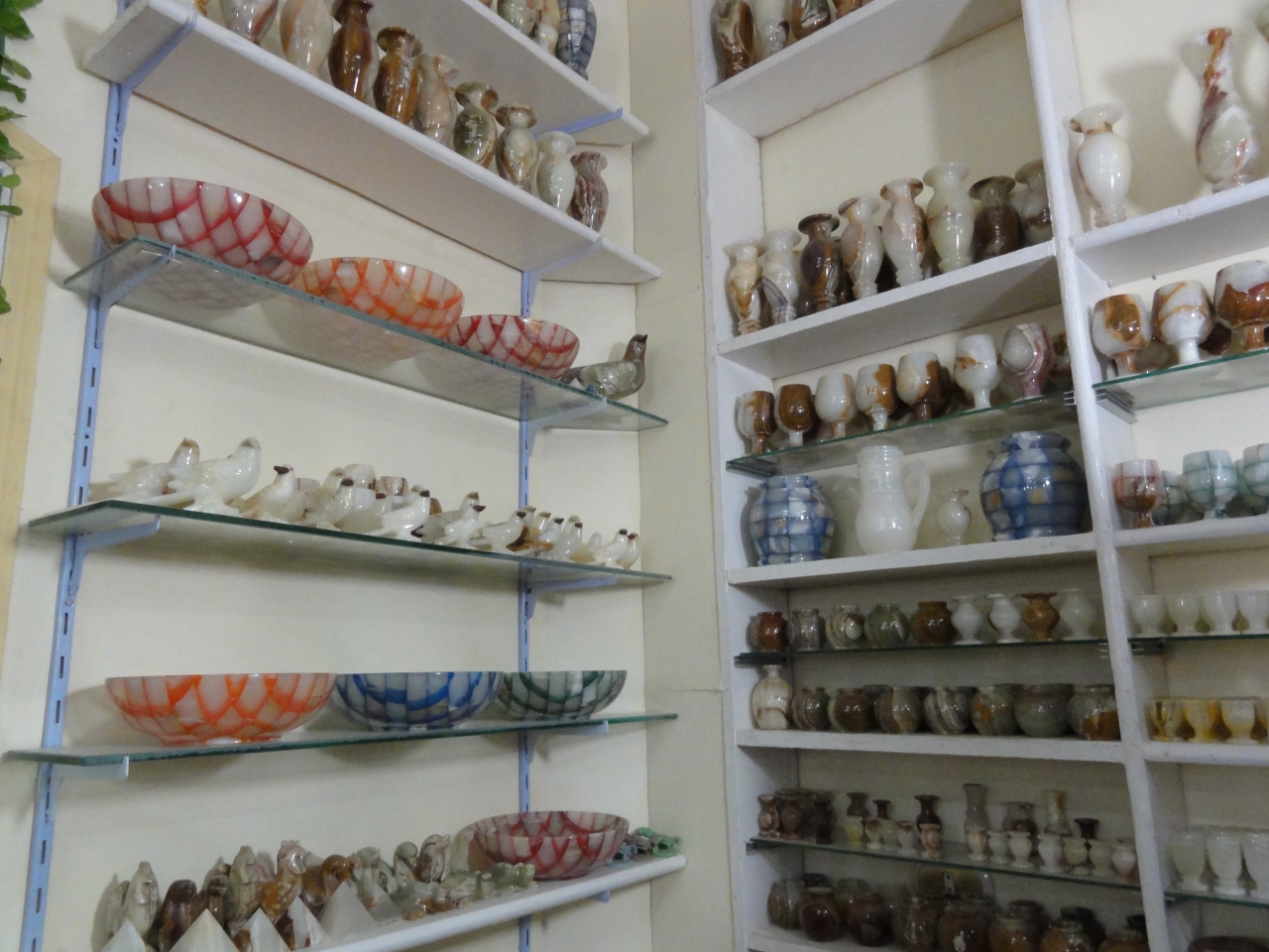 王家の谷観光後、ツアーで案内されたお土産屋さんです。看板からもわかるように多くの日本人が来てるようです。お店に入る前に大理石の加工方法など見せてくれました。入ると日本語上手な店員さんが店内を案内、大理石の壷や飾り物、装飾品など商品について説明してくれたり、偽物と本物の違いなど教えてくれました。値段交渉ではガイドさんが大活躍、交渉成立、支払いが済んだら、目の前で商品を壊れないようプチプチでグルグル巻きにしてくれます。ハイビスカスのお茶のサービスもありました。
