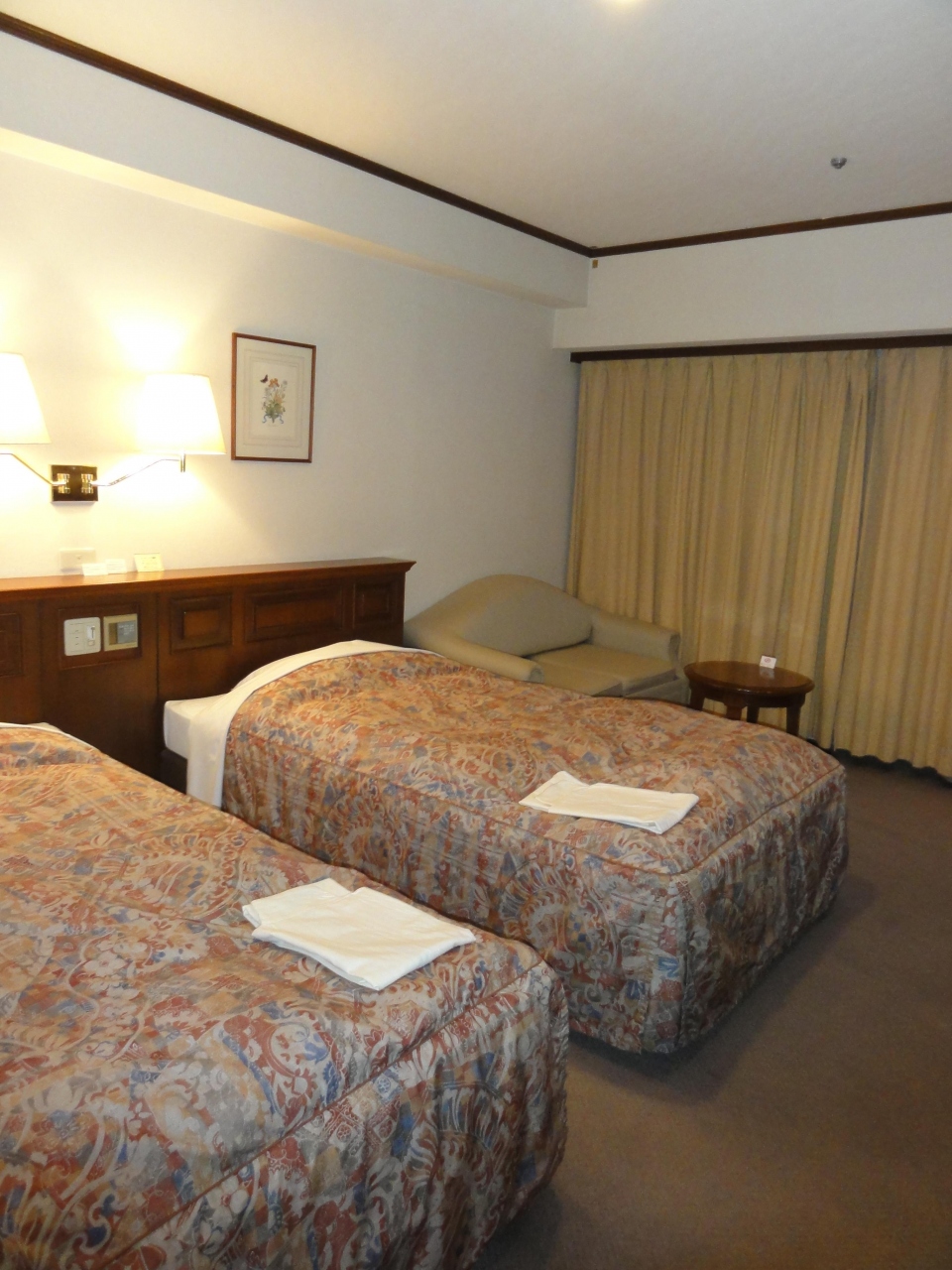 長崎の市電「思案橋」から徒歩5分、外観は地味で看板も小さく、見落としそうですが中は使い勝手いいホテルでした。2階がフロントで、自販機と貸し出し用のPCケーブル、荷造り紐、ガムテープ、爪切り他色々あります。朝食会場も2階にあり、飲み物のティーパック等は必要分をここから部屋に持ち込むようになっていました。素泊まりで申し込みましたが、無料の朝食があり、バナナ、サラダパン(ポテトサラダを挟んだもの)に珈琲や紅茶、日本茶、牛乳があり7時から9時半まで利用出来ました。部屋はツインでしたが広く、ベッドも大き目、壁に大きな時計もあり便利でした。サービスとして500mlの水も2本、湯沸しポット、加湿器もありました。アメニテイは歯ブラシしか置かれてませんが、櫛や剃刀、綿棒等は廊下やフロント周辺に置かれていました。