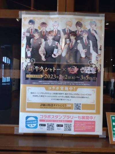 ウオーキングで牛久シャトーに行きますが、建物に入ることなくいましたが久々に入るとイケメンが樽の隣に立ってました。スマホにある恋愛ゲーム『イケメンヴァンパイア◆偉人たちと恋の誘惑』、『イケメン王子 美女と野獣の最後の恋』とのコラボイベント中でした。期間は2/2~3/5で、飾ってあるのはパネルだけでしたが内容を調べると見学ツアーもあり、非公開の本館が見られるとありました。静かなシャトー、賑わうといいなと思いました。